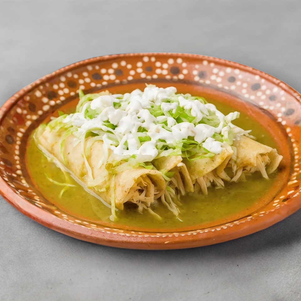 Deliciosa tortilla rellena de frijol colado frita con carne enchilada, lechuga, tomate, cebolla morada curtida y aguacate.