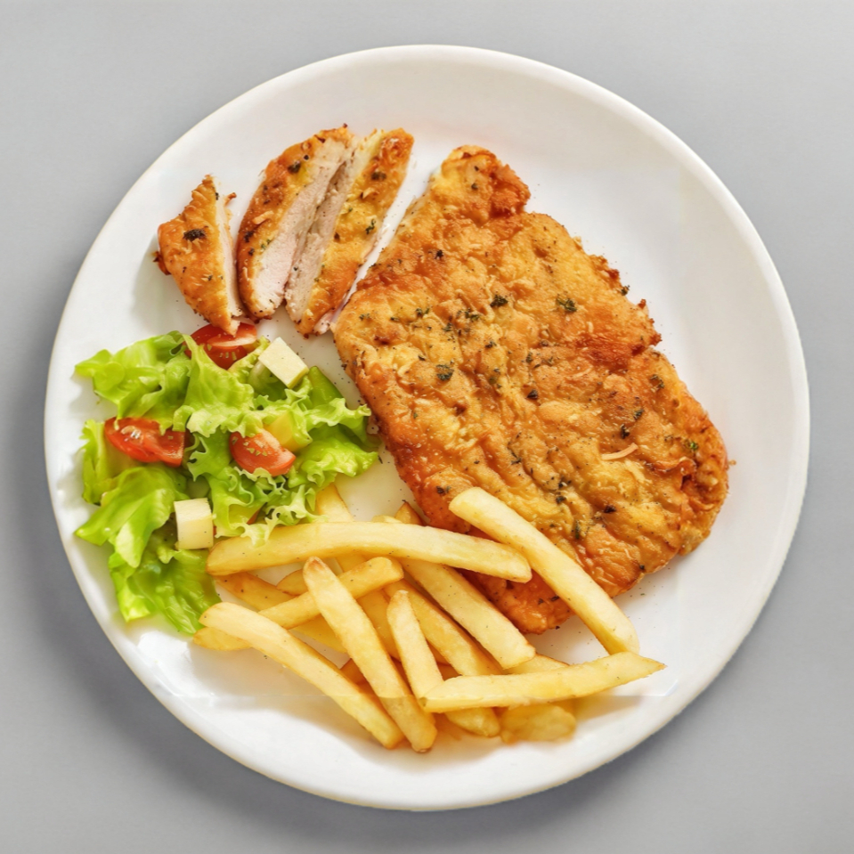 Filete de pechuga de pollo empanizada, acompañada de ensaladas ,arroz ,frijol y papas fritas. Incluye sopa , agua del dia ,tortillas y salsas.