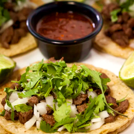 Taco de arrachera, con limón, cebolla, cilantro, preparación y tamaño a elección.
