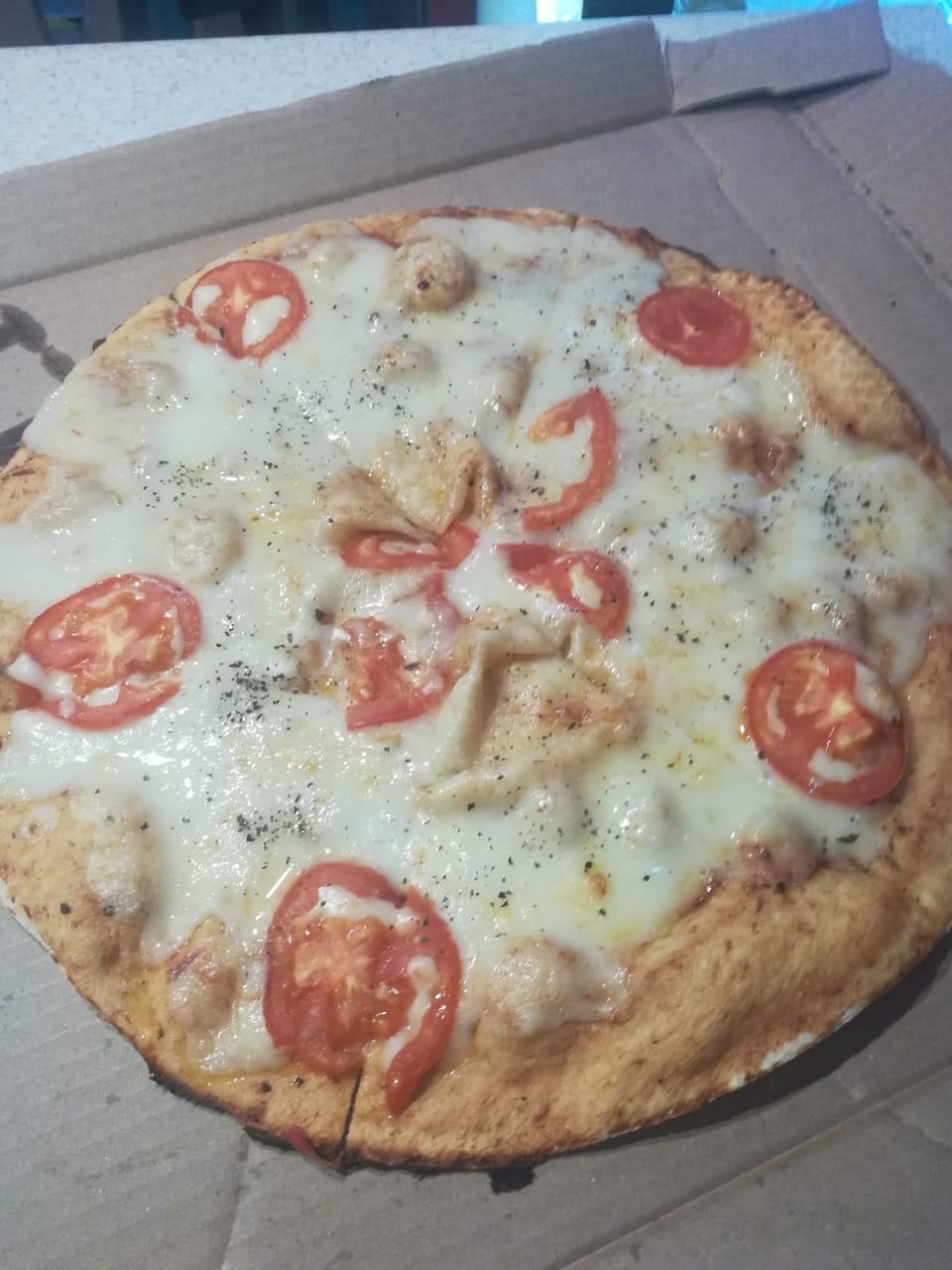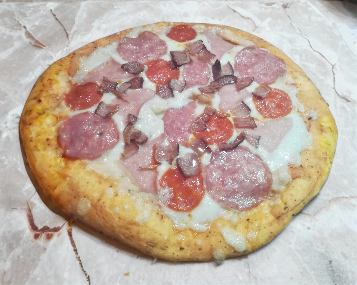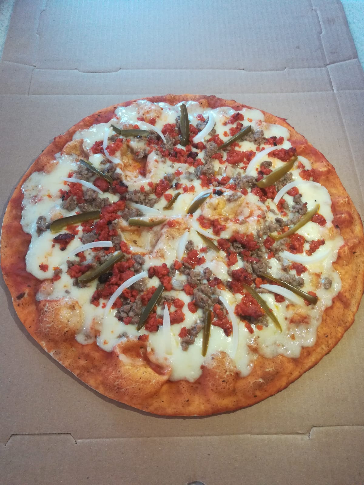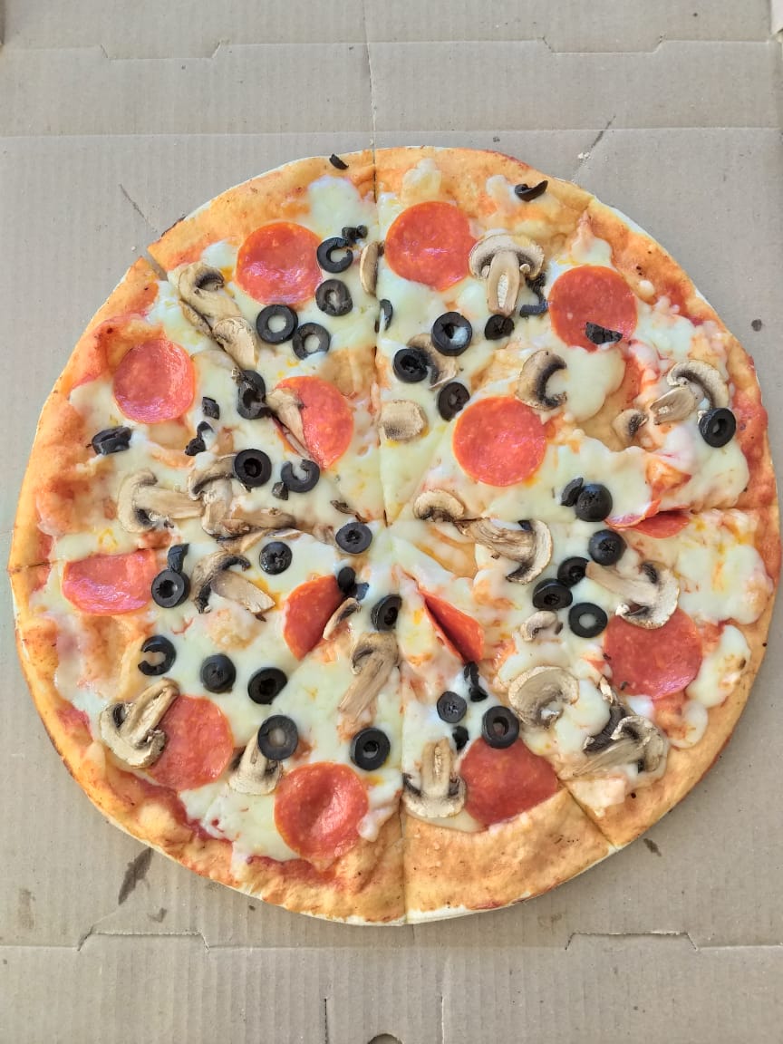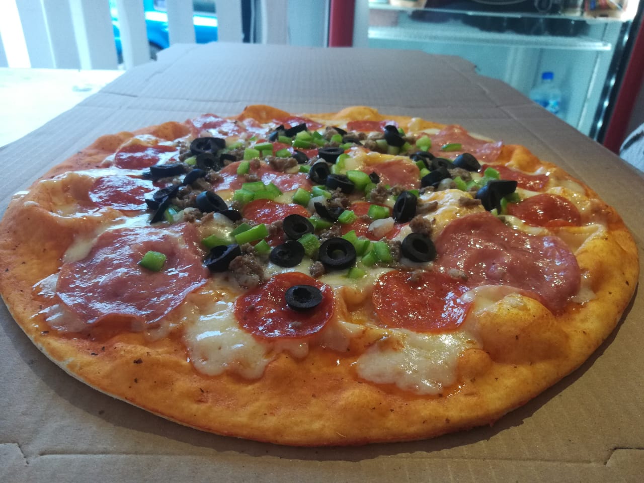 Salami, pepperoni, carne molida, pimiento morrón, aceitunas negras.