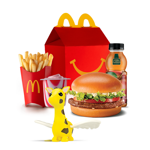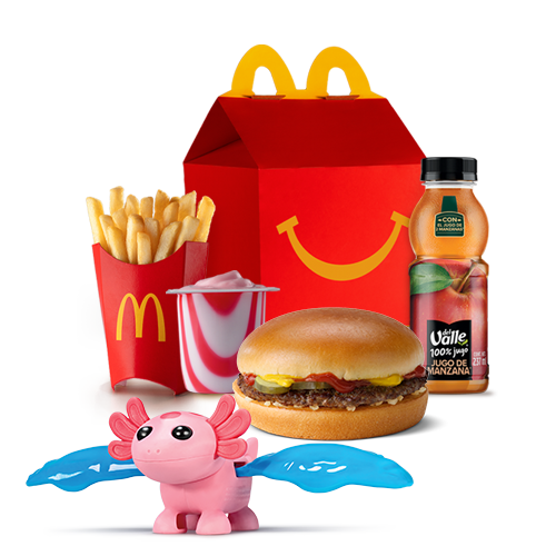 Pide tu Cajita Feliz de Hamburguesa; Incluye papas kids y Yoplait.