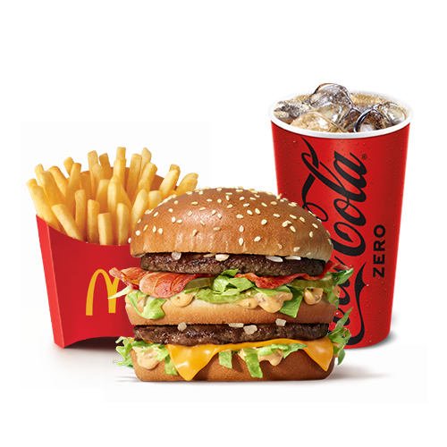 Hamburguesa con 2 Carnes Signature, pan tipo brioche, lechuga, jitomate, queso cheddar, tocino y salsa especial. Incluye papas y refresco de 21oz.