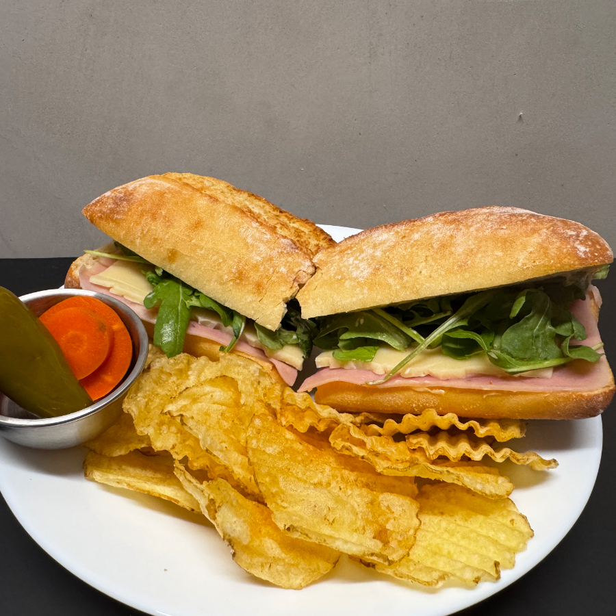 Pan Ciabatta con Jamón de Pavo, Queso Manchego, Mayonesa y Arugula. (Jalapeños y Chips a un Lado)