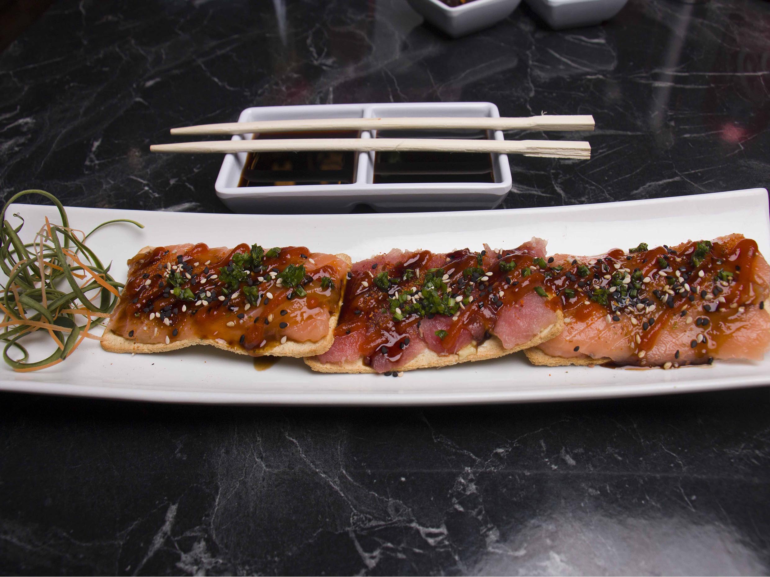 3 tostadas montadas con aguacate , philadelphia, salmón, salsa spicy, cebollin, sirasha, salsa de anguila y un toque de togarashi.