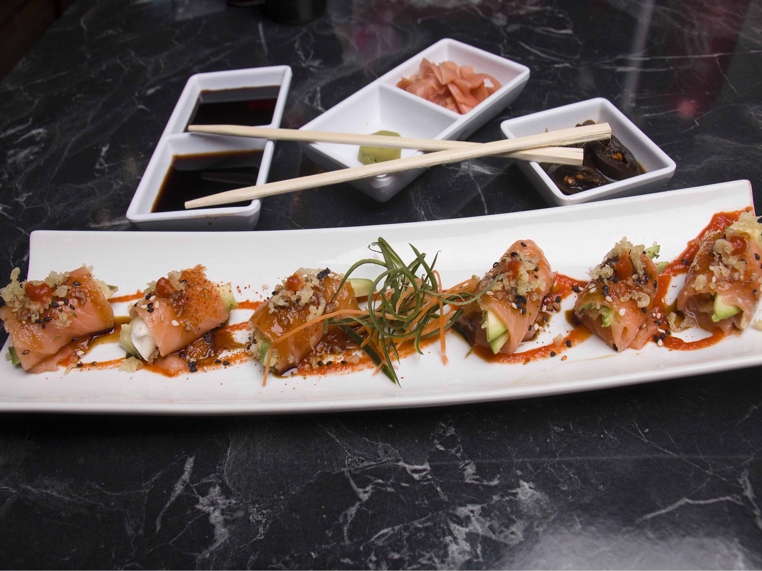 Philadelphia, aguacate y chispas tempura, envueltos con salmón fresco, bañados con salsa dulce, sriracha, soya y furikake de camarón (6 piezas).