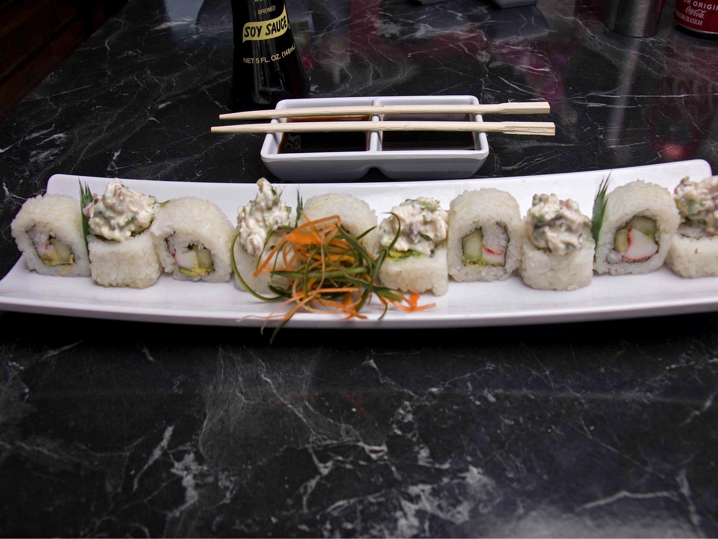 Por dentro deliciosa ensalada de cangrejo, pepino y aguacate, por fuera la combinación de Salmón, Atún, Dorado y Camarón.