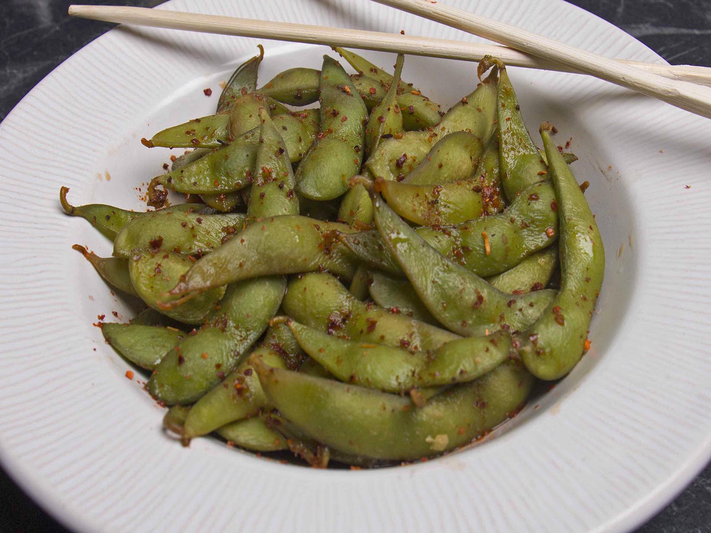 Vainas de frijol de soya salteados con soya, limón y un toque de tajín.