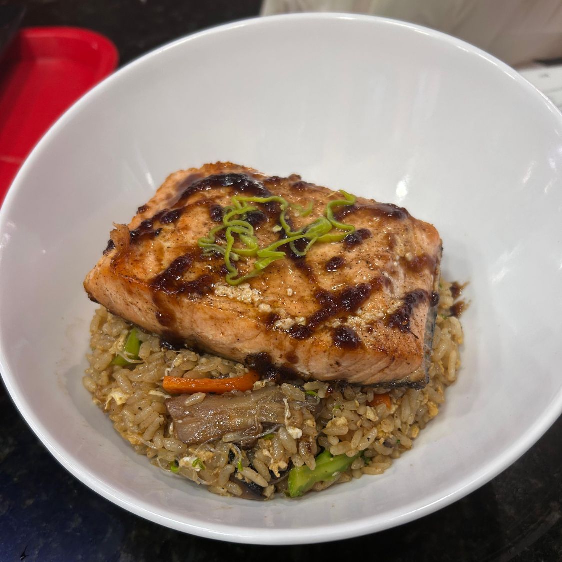 Lonja de salmon servida sobre arroz a la plancha con verduras, huevo, champiñones y laminas de chile habanero.
