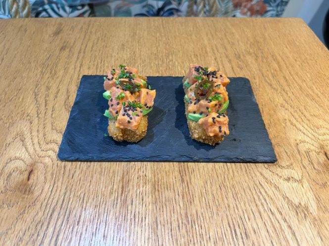 2 PZ DE ARROZ DE SUSHI EMPANIZADO CON AGUACATE, ATÚN SPICY Y CHILES TOREADOS