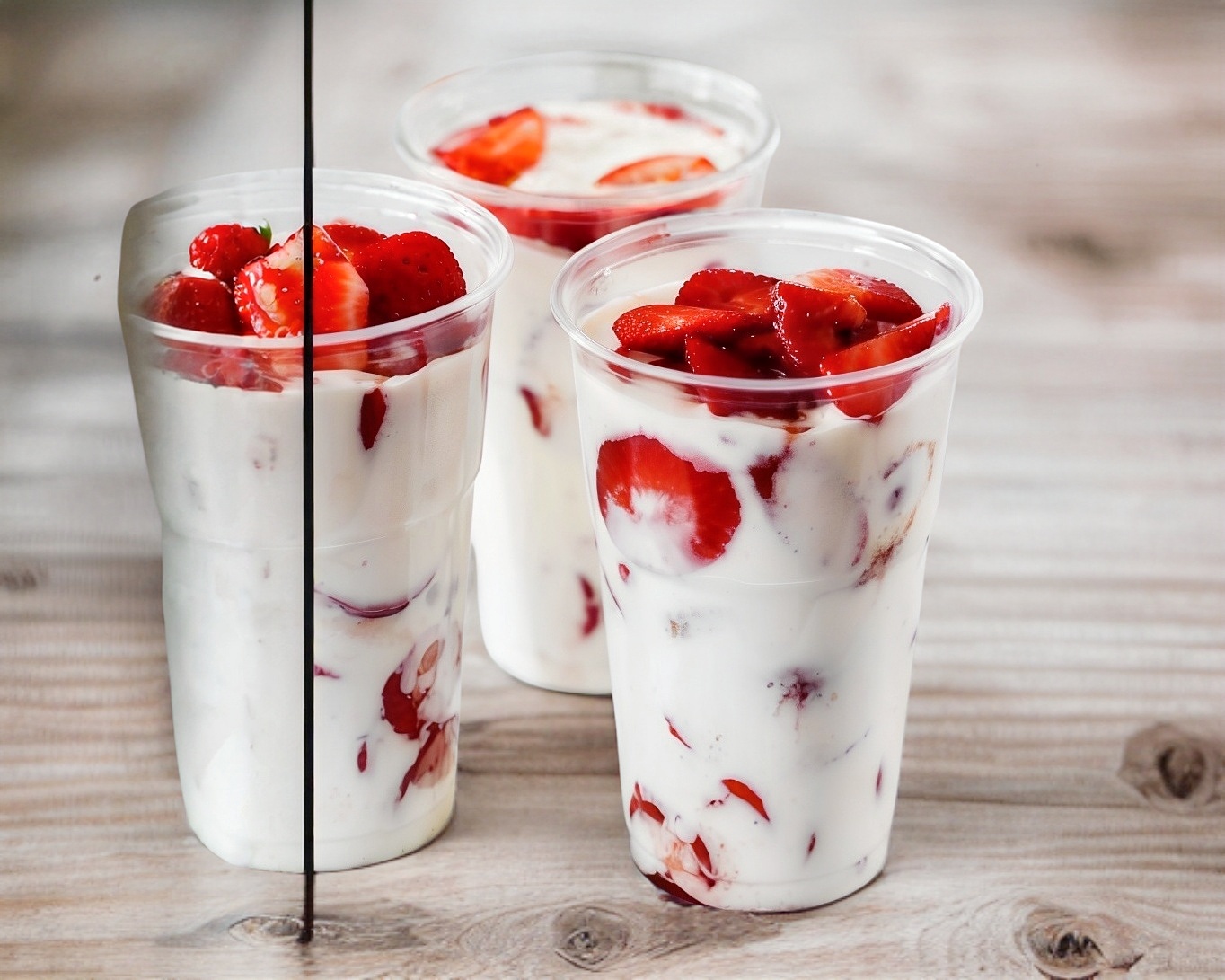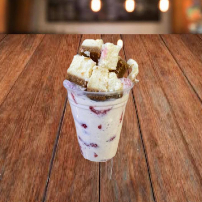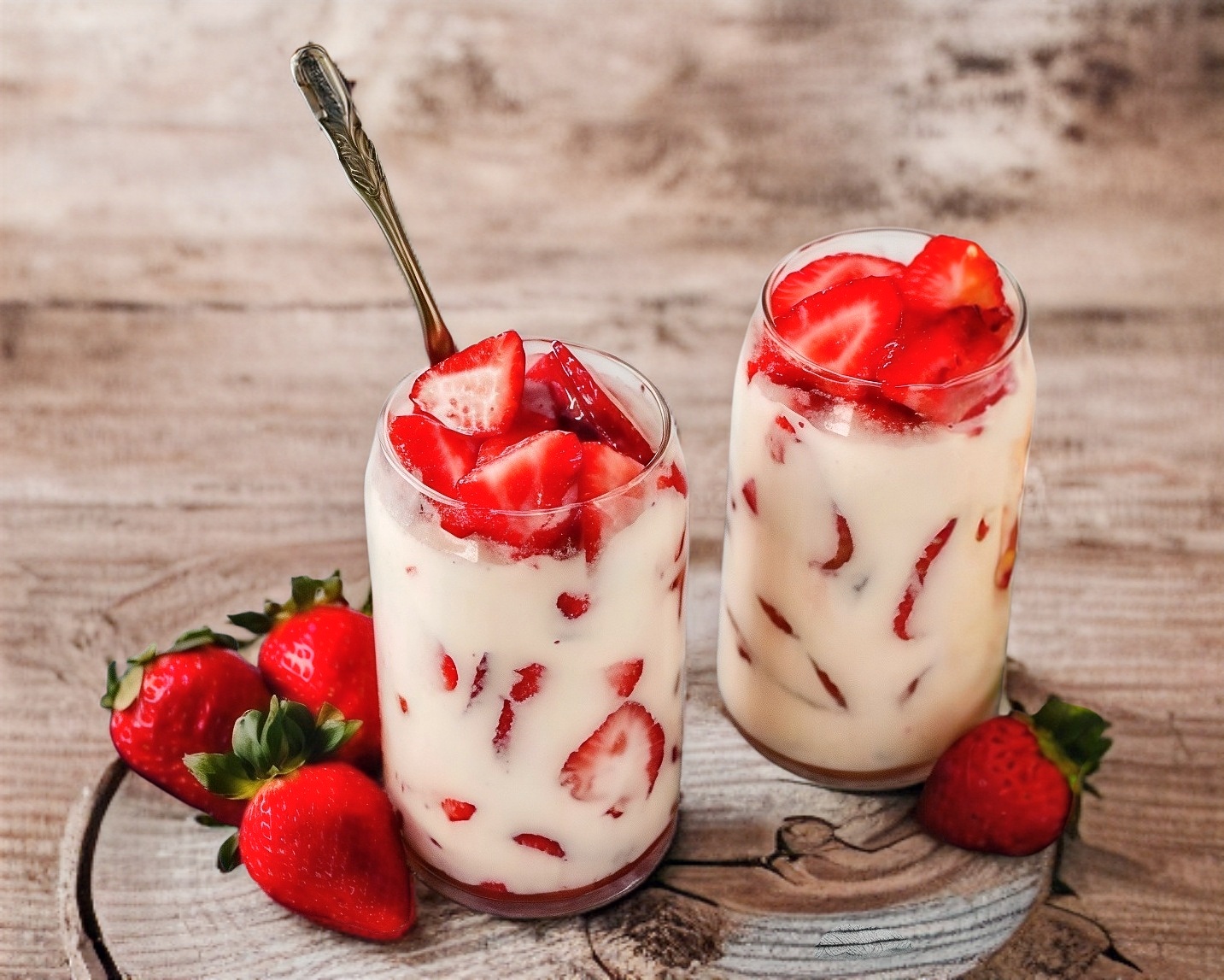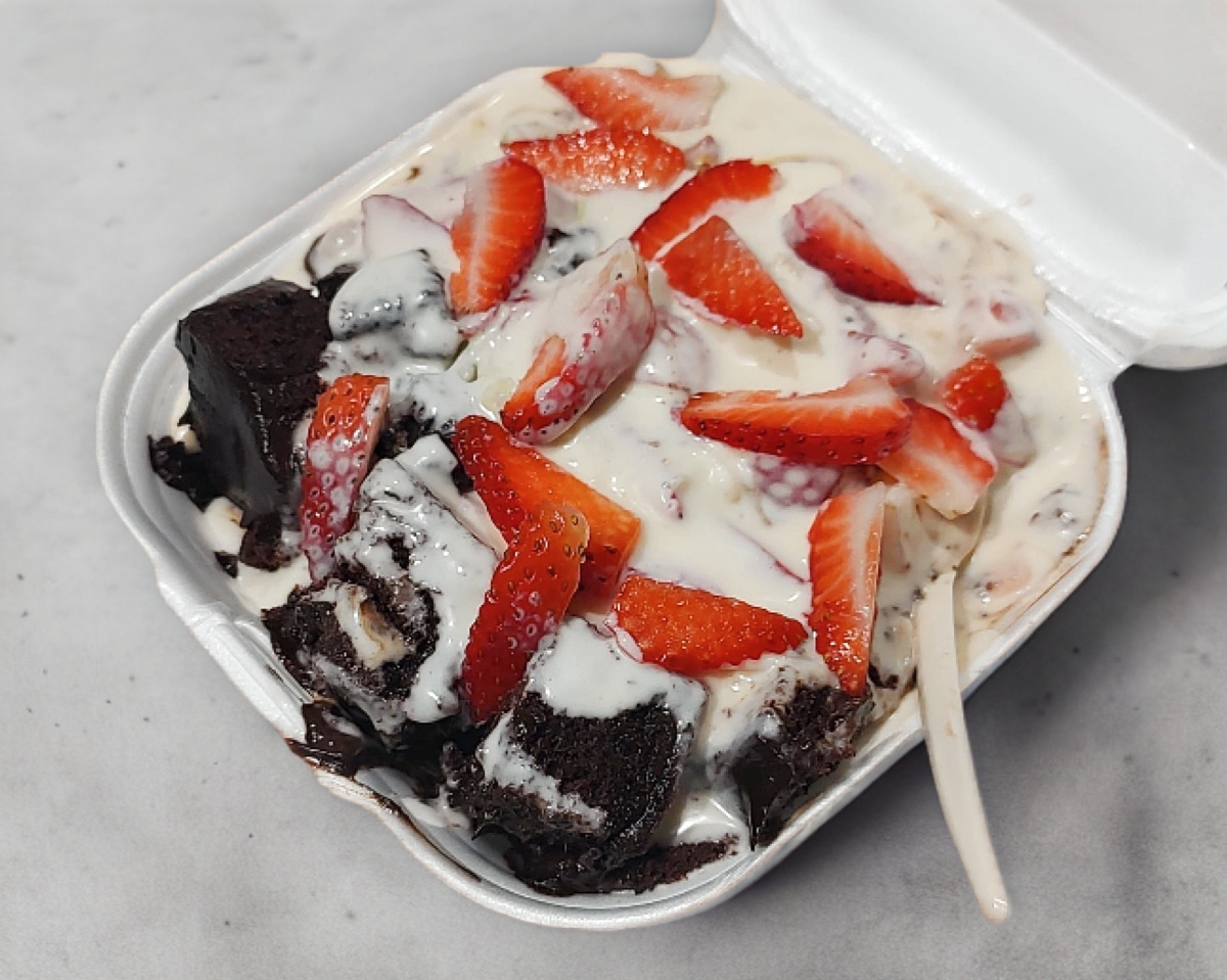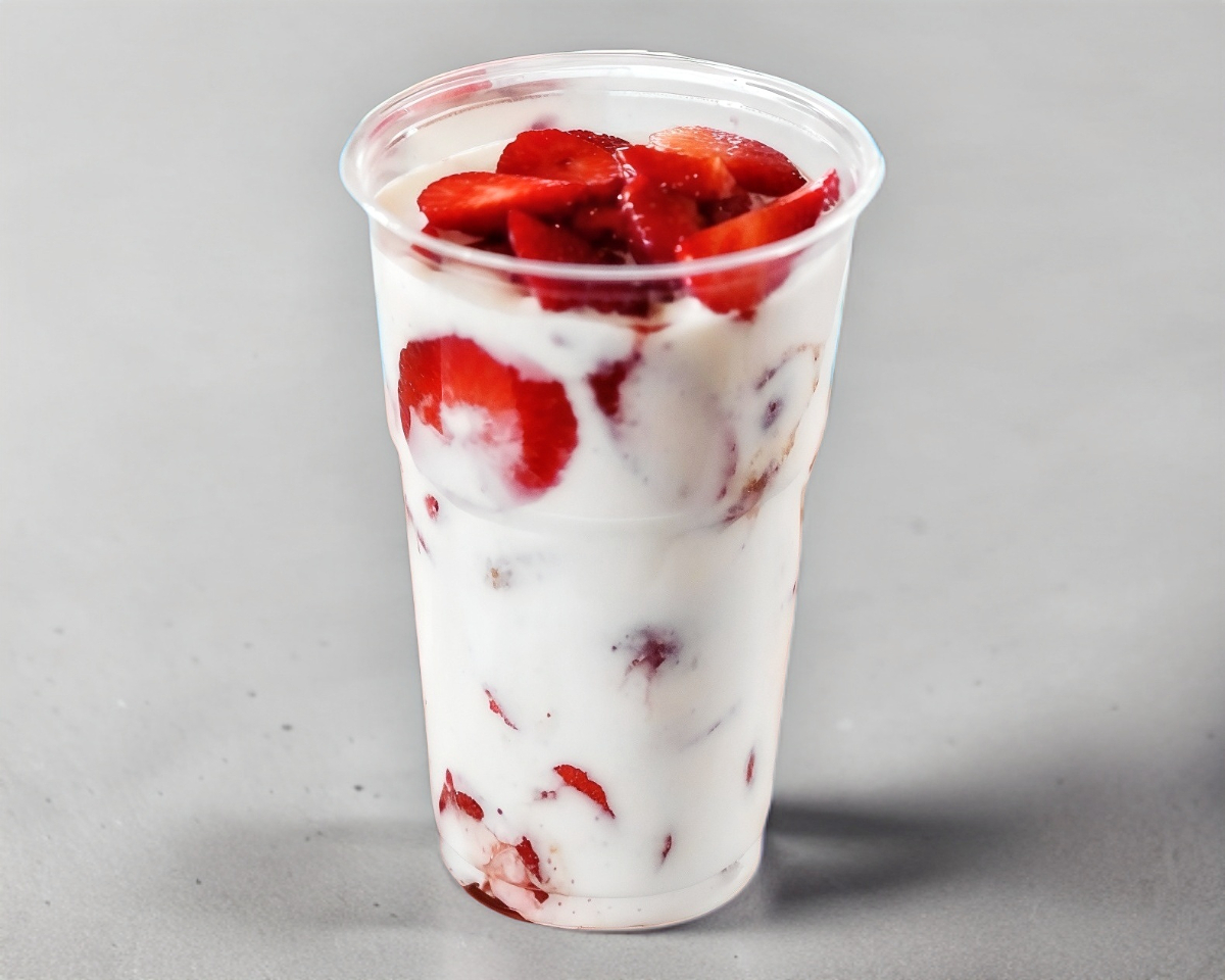 1 Litro de Deliciosas fresas con crema y una rebanada de cheesecake a elegir en cubos
