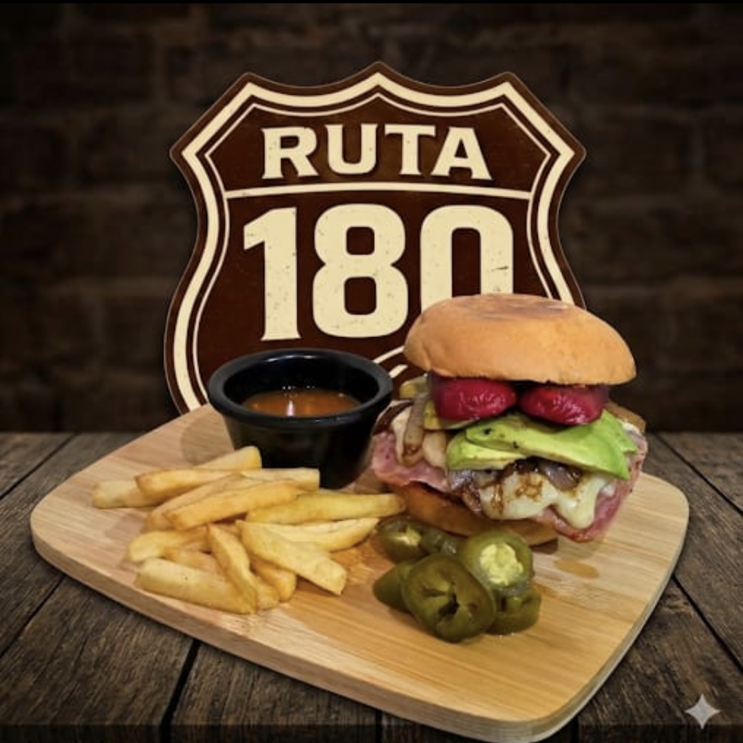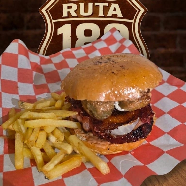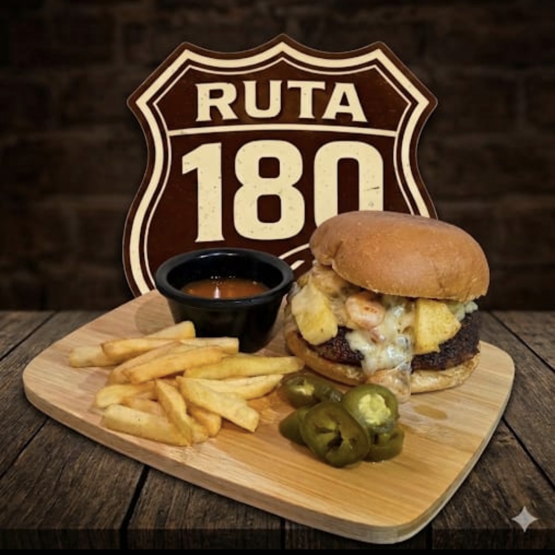Es para valientes, con jalapeño popper, adobo de la casa, aro de cebolla cubierto en tocino y relleno de queso. Acompañado de papas a la francesa y aderezos de la casa.