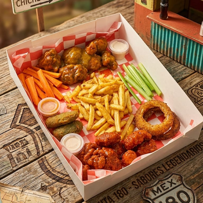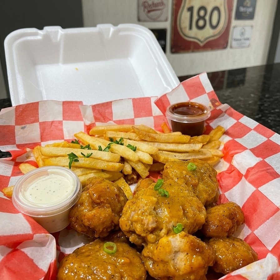 6 pzs de crujiente pechuga de pollo bañada con su salsa de preferencia, acompañado con 1/2 orden de papas a la francesa, aderezo ranch y verduras.