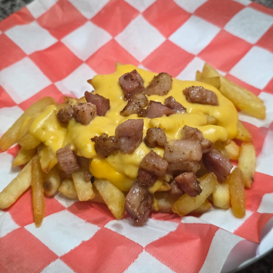 Crujientes papas bañadas con receta secreta de queso fundido con crocante tocino.