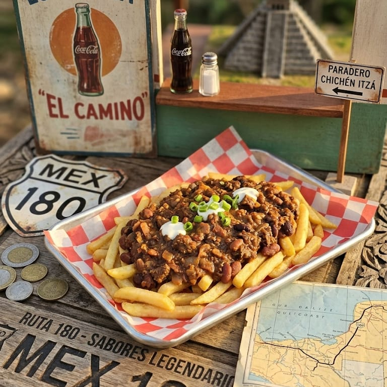 Nuestras crocantes papas a la francesa bañadas en salsa de queso y exquisito chilli.