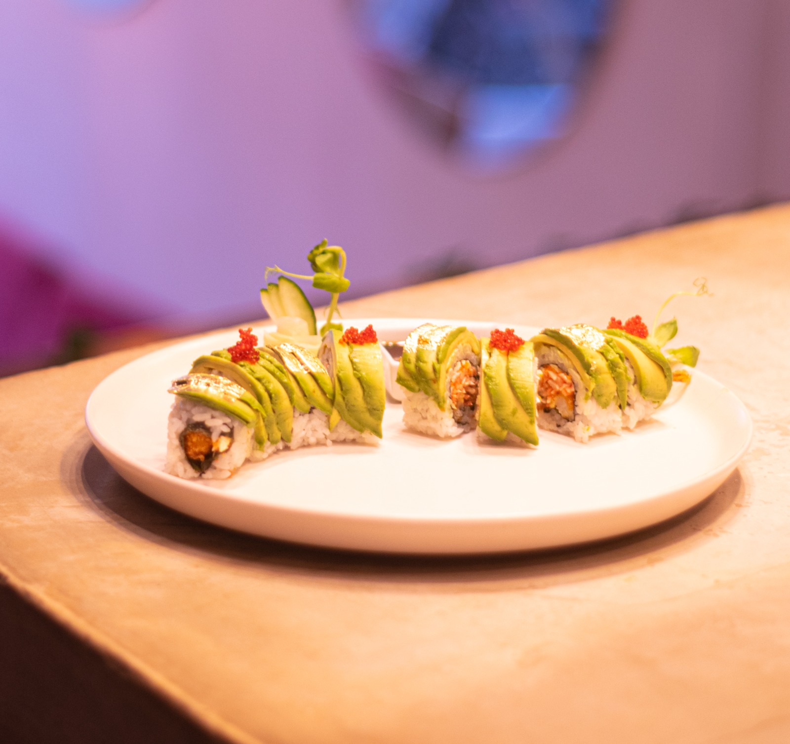 Por dentro: aguacate, pepino, arugula por fuera: mango
