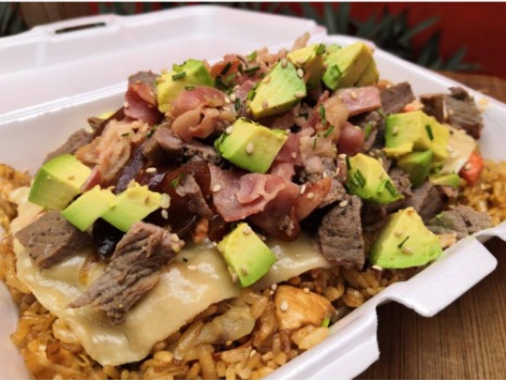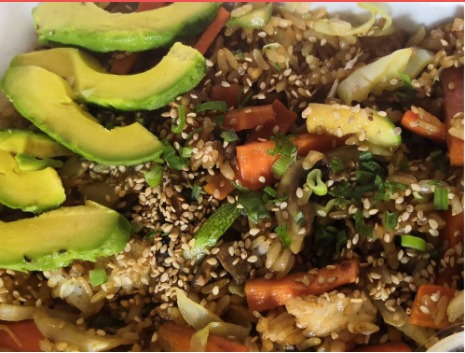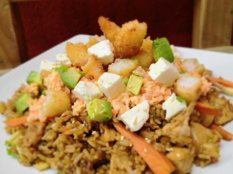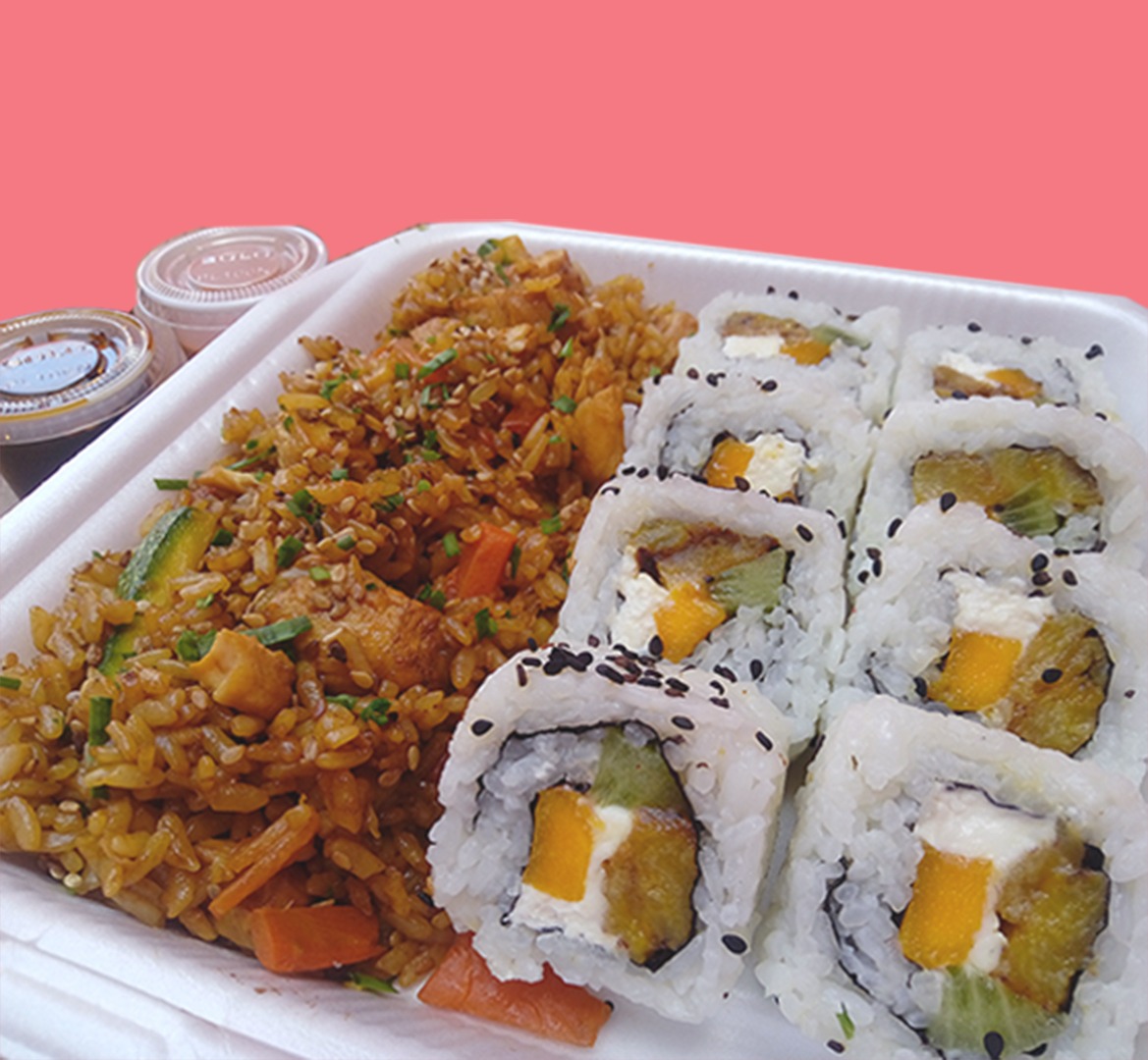 Arroz frito con zanahoria, calabaza, col y cebolla, sazonado al estilo oriental. Acompañado de aguacate, salsa de soya, aderezo chipotle y chiles toreados / 500gr