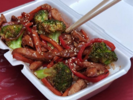 Asado de pechuga de pollo con brócoli, pimiento, champiñón, apio y cebolla. Sobre una cama de arroz blanco y nuestra increíble salsa oriental /600 gr