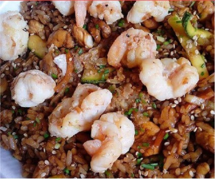 Asado de camarones con brócoli, pimiento, champiñón, apio y cebolla. Sobre una cama de arroz blanco y nuestra increíble salsa oriental /600 gr