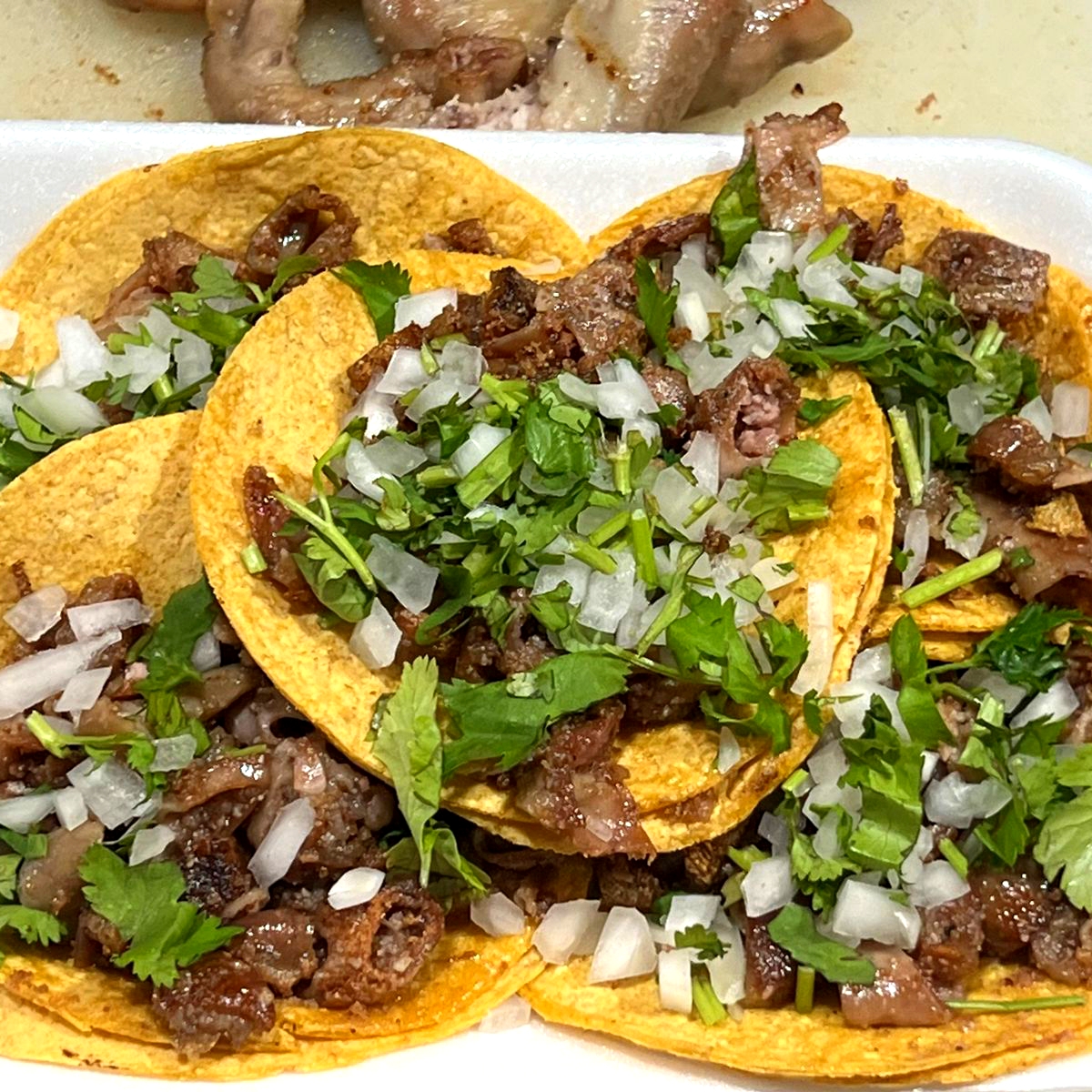 Tortilla de maíz, amarilla, tripa de res , cebolla y cilantro