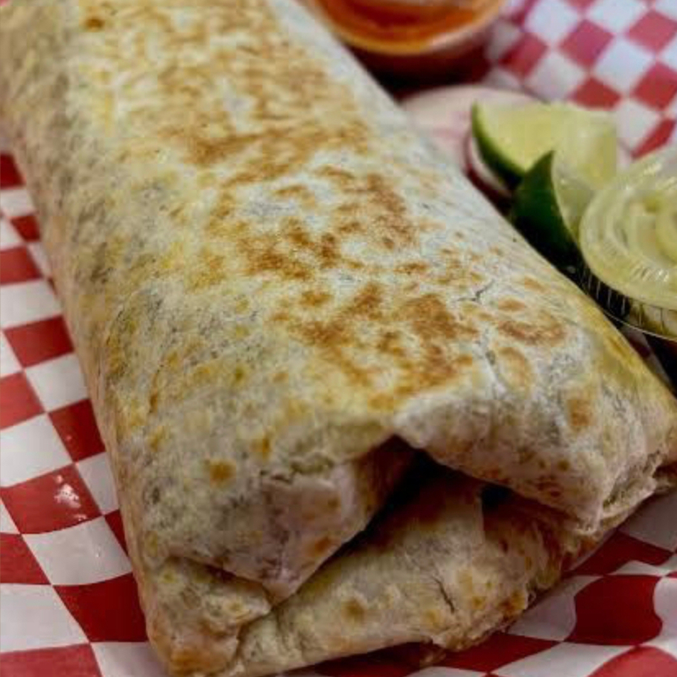 Tortilla de harina burrera, carne de res marinada arrachera, lechuga,frijol,queso Oaxaca