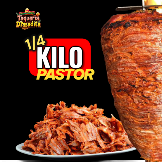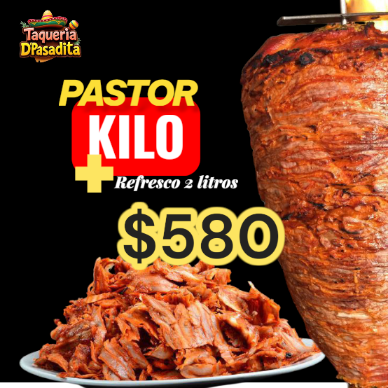 1 kg de carne al pastor: incluye tortillas, porción de cebolla,clantro limón ,piña & salsa. Incluye un refresco de 2 litros