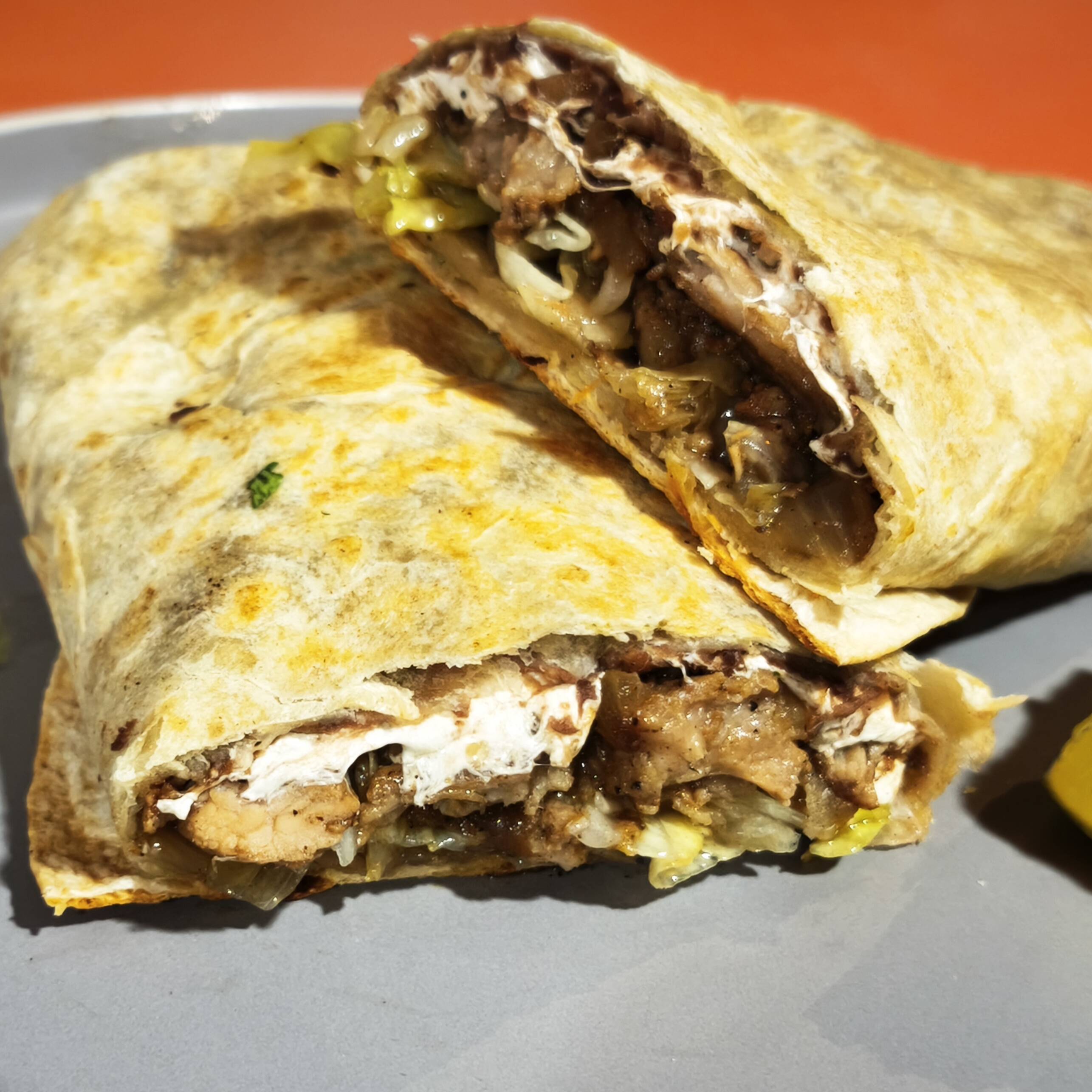 TORTILLA BURRERA DE HARINA, CARNE ASADA,QUESO,FRIJOL, LECHUGA, CREMA Y CEBOLLA ASADA