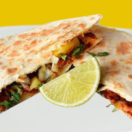 2 tortilla de harina una sobre otra con queso, carne al pastor, cebolla,cilantro y piña