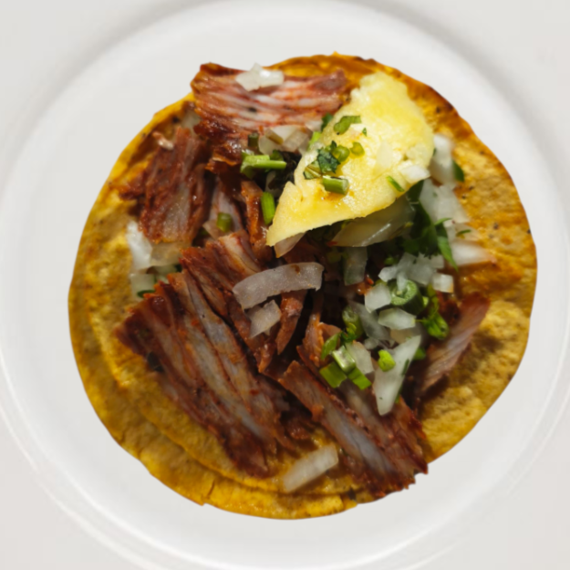 Tortilla amarilla de maíz, carne al pastor, cebolla ,cilantro y piña.