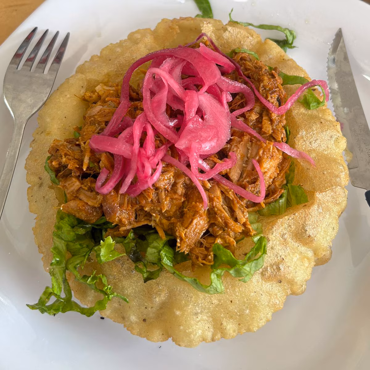 Base crujiente de tortilla con asada de cerdo, cubierta con los ingredientes frescos y vibrantes de la cocina yucateca.