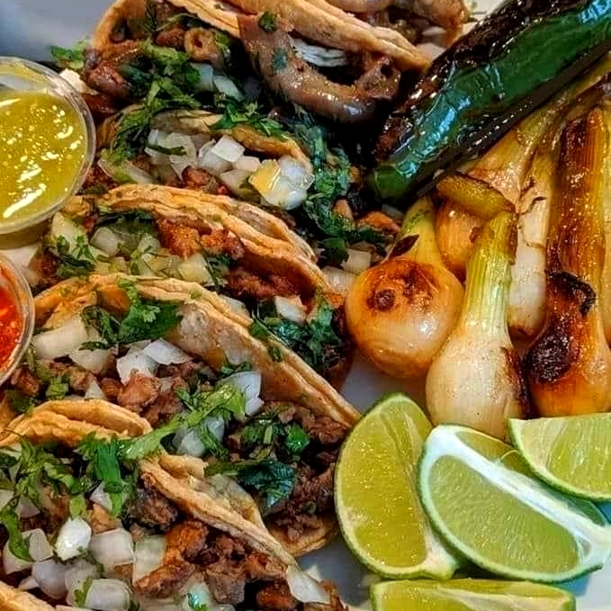 Tacos de tortilla de maíz, asada de cerdo y chorizo mixto. Acompañado con cebolla y cilantro.