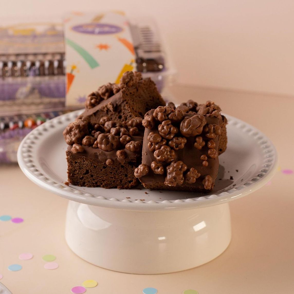 Exquisitos brownies de chocolate con una capa de cremosa Nutella y decorado con crujientes Crunch Rocks de arroz inflado cubierto de chocolate con leche.