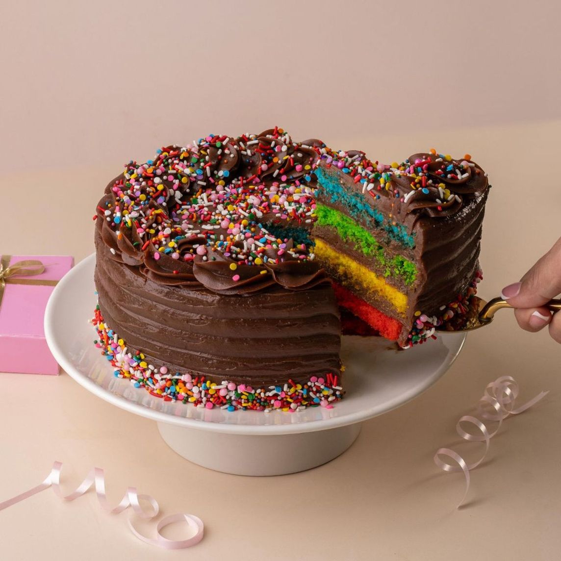 Pastel elaborado con panes de colores a base de mantequilla mojado con almíbar. Relleno con capas de fudge; cubierto con fudge y decorado con sprinkles de colores.