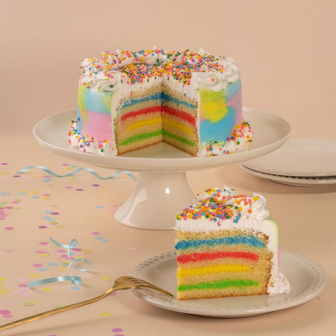 Pastel con pan de mantequilla, mojado con tres leches. Con relleno de colores a base de queso crema y tres leches, cubierto con chantilly vainilla y decorado con confetti comestible.