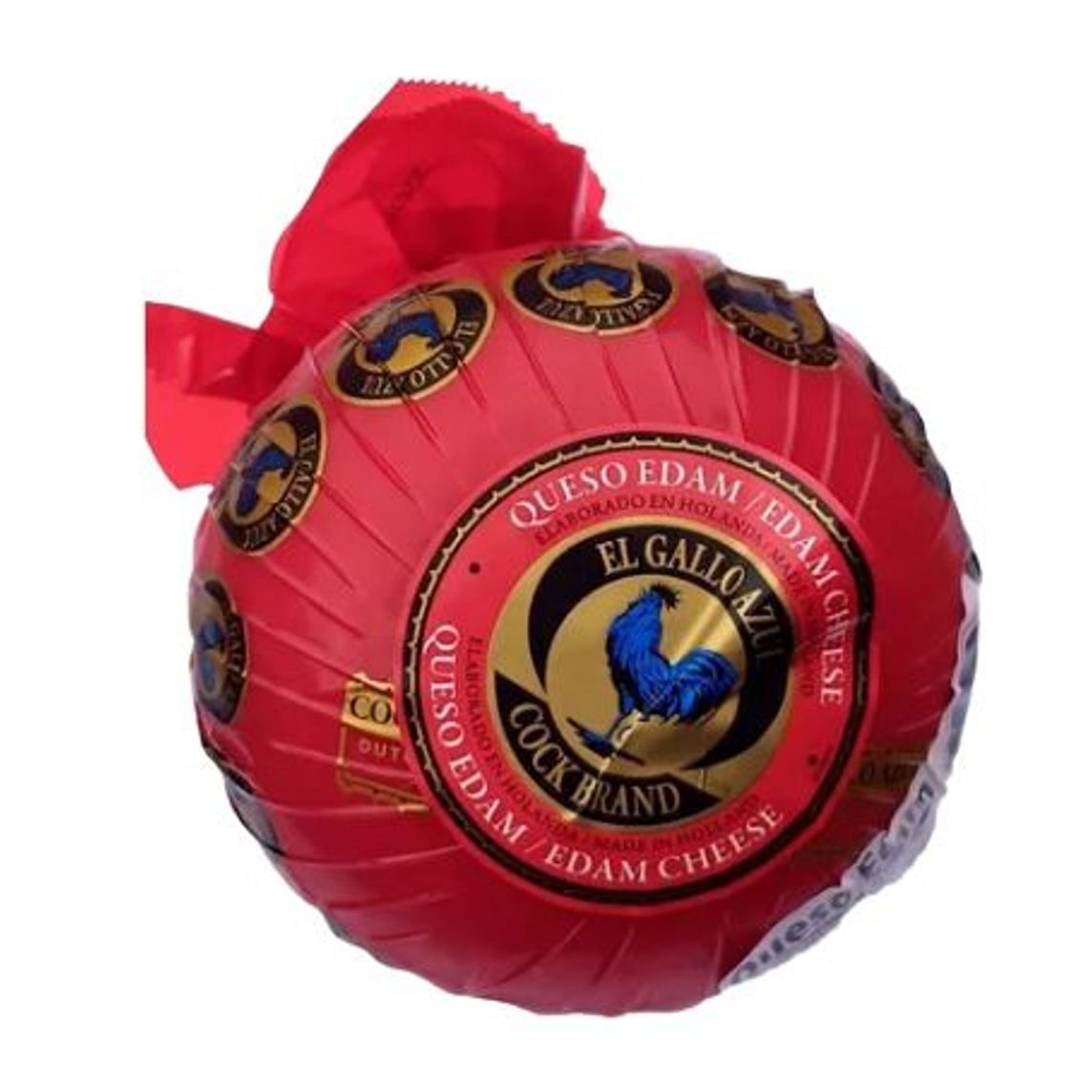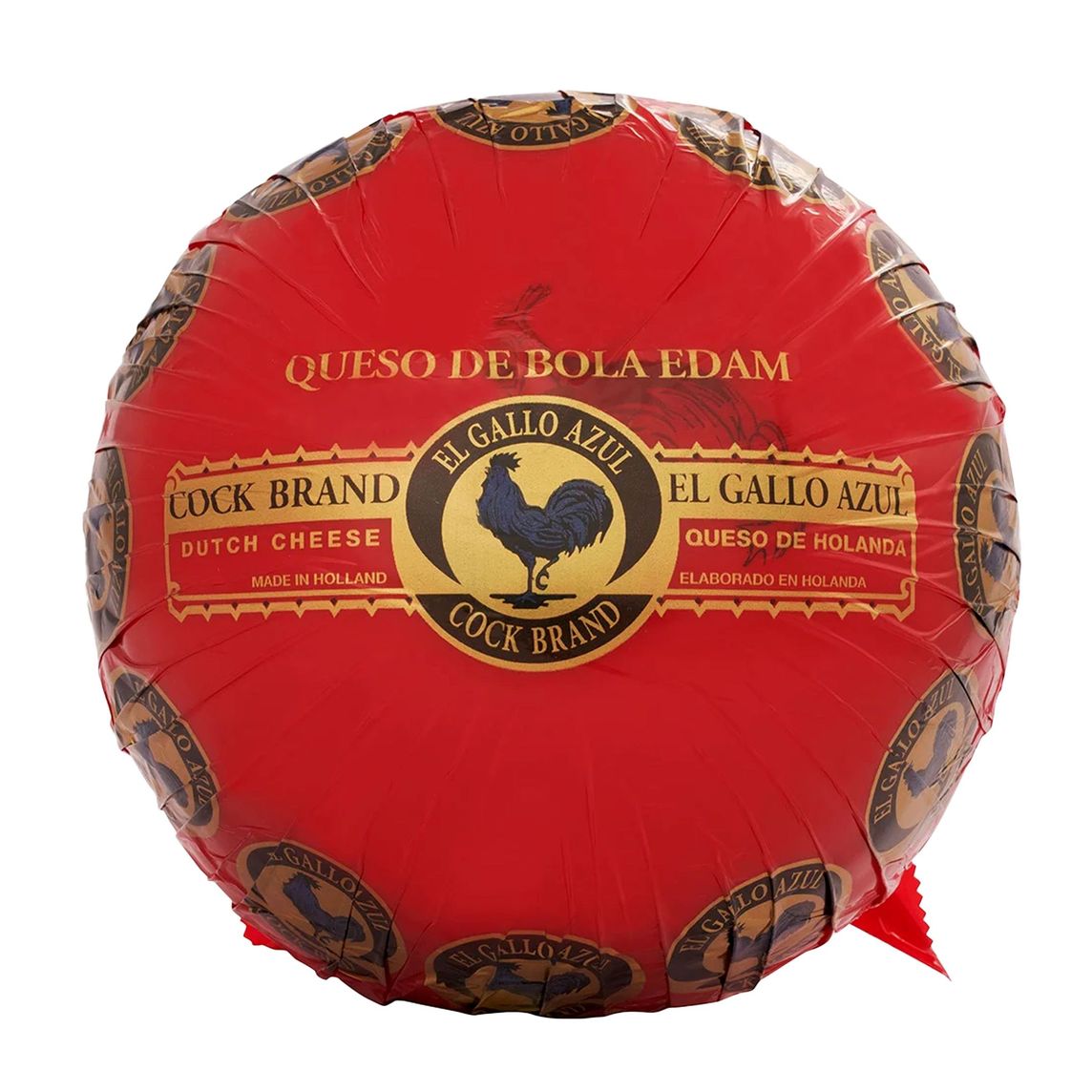 Original queso de bola tipo Edam de El Gallo Azul, elaborado en Holanda. Sabor ligeramente salado, de textura semidura, con corteza amarilla y cera roja. Aprox. .75 kg