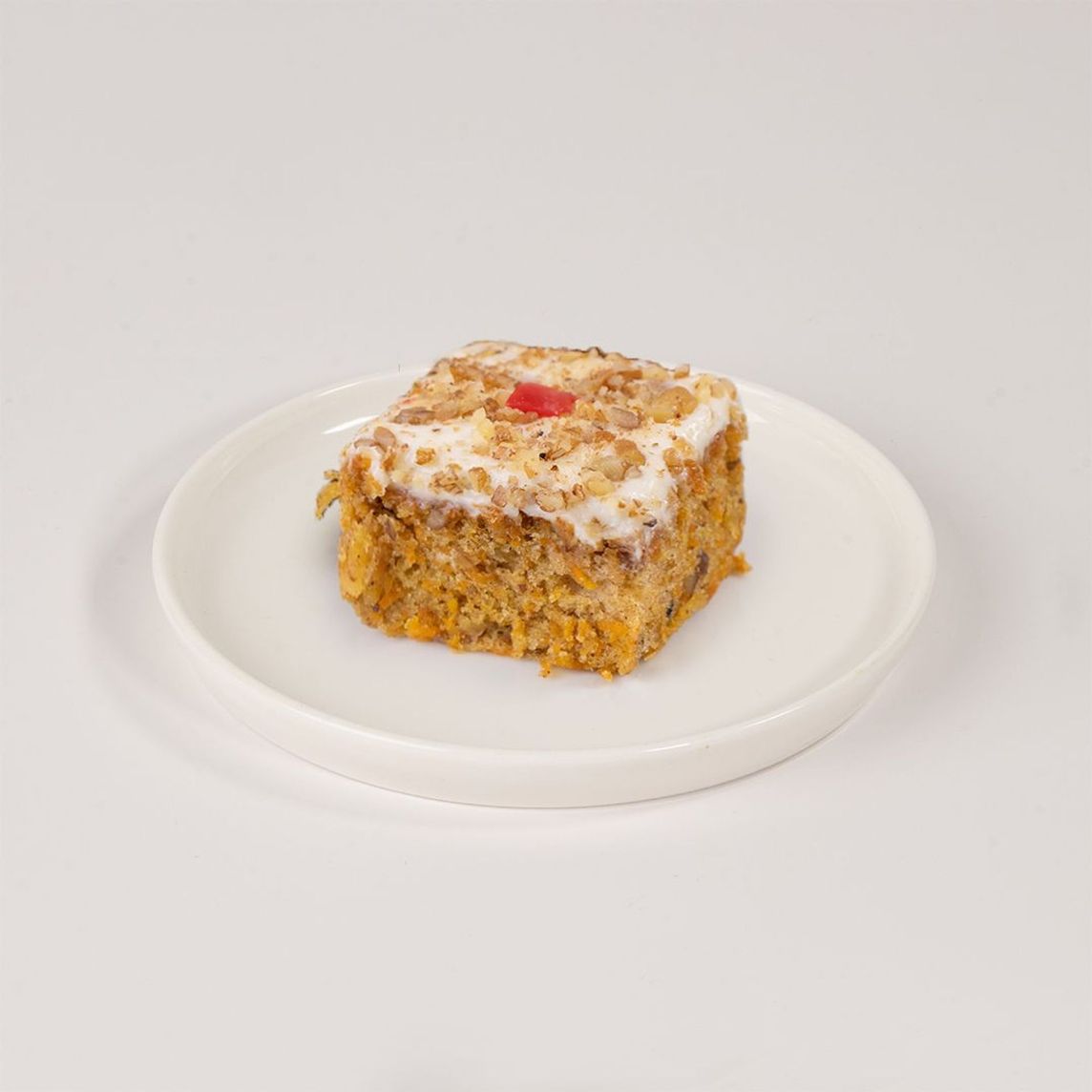 Exquisito pan hecho a base de zanahoria, piña y nuez, decorado con queso crema, nuez, y cereza.