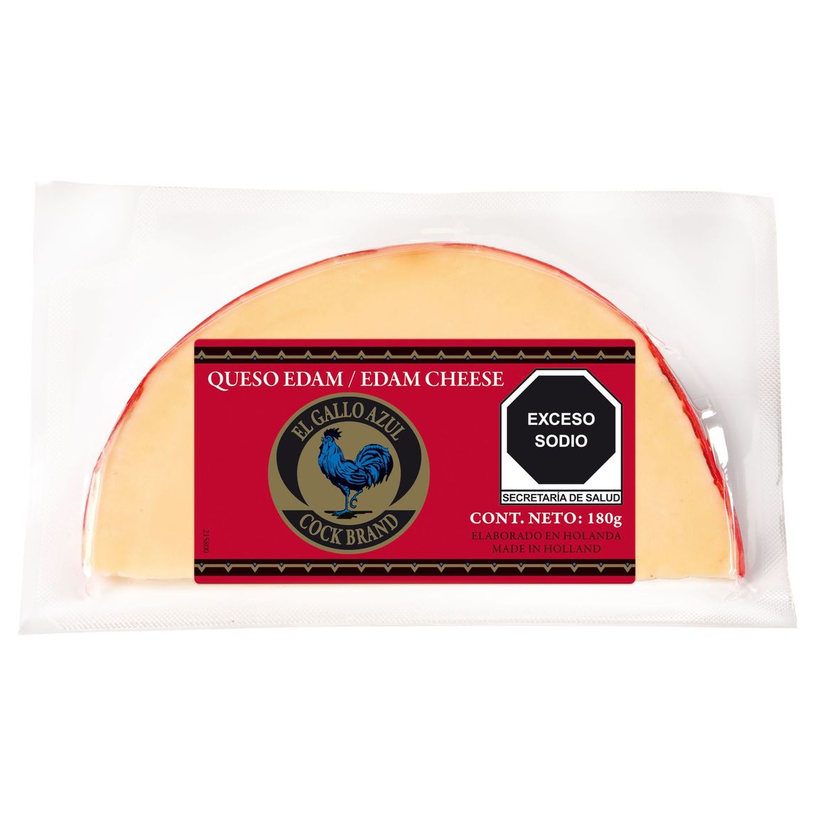 Rebanada de original queso de bola tipo Edam de El Gallo Azul, elaborado en Holanda. Sabor ligeramente salado, de textura semidura, con corteza amarilla y cera roja. Contenido neto 180 gr