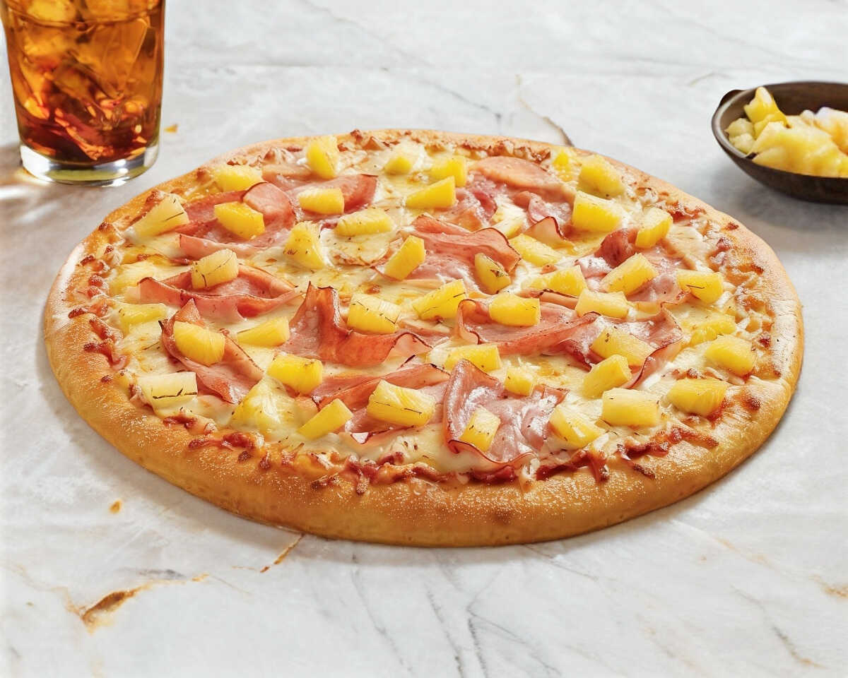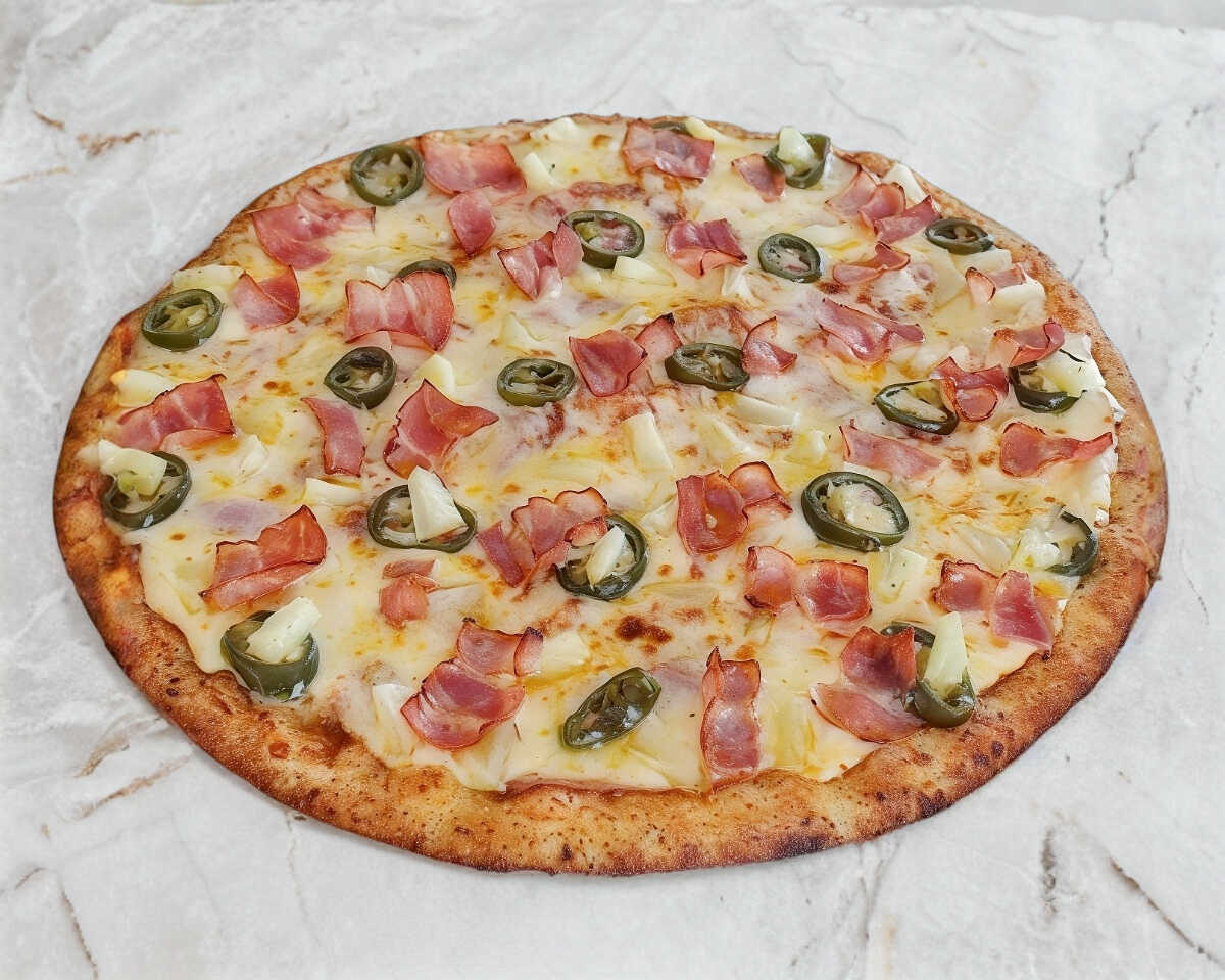 (jamón, tocino, piña, jalapeños y mozzarella)