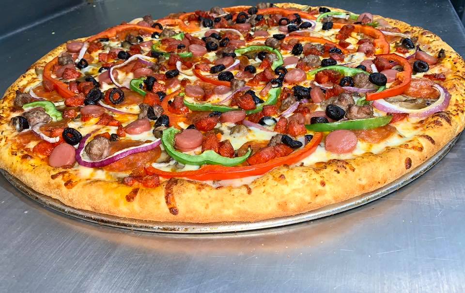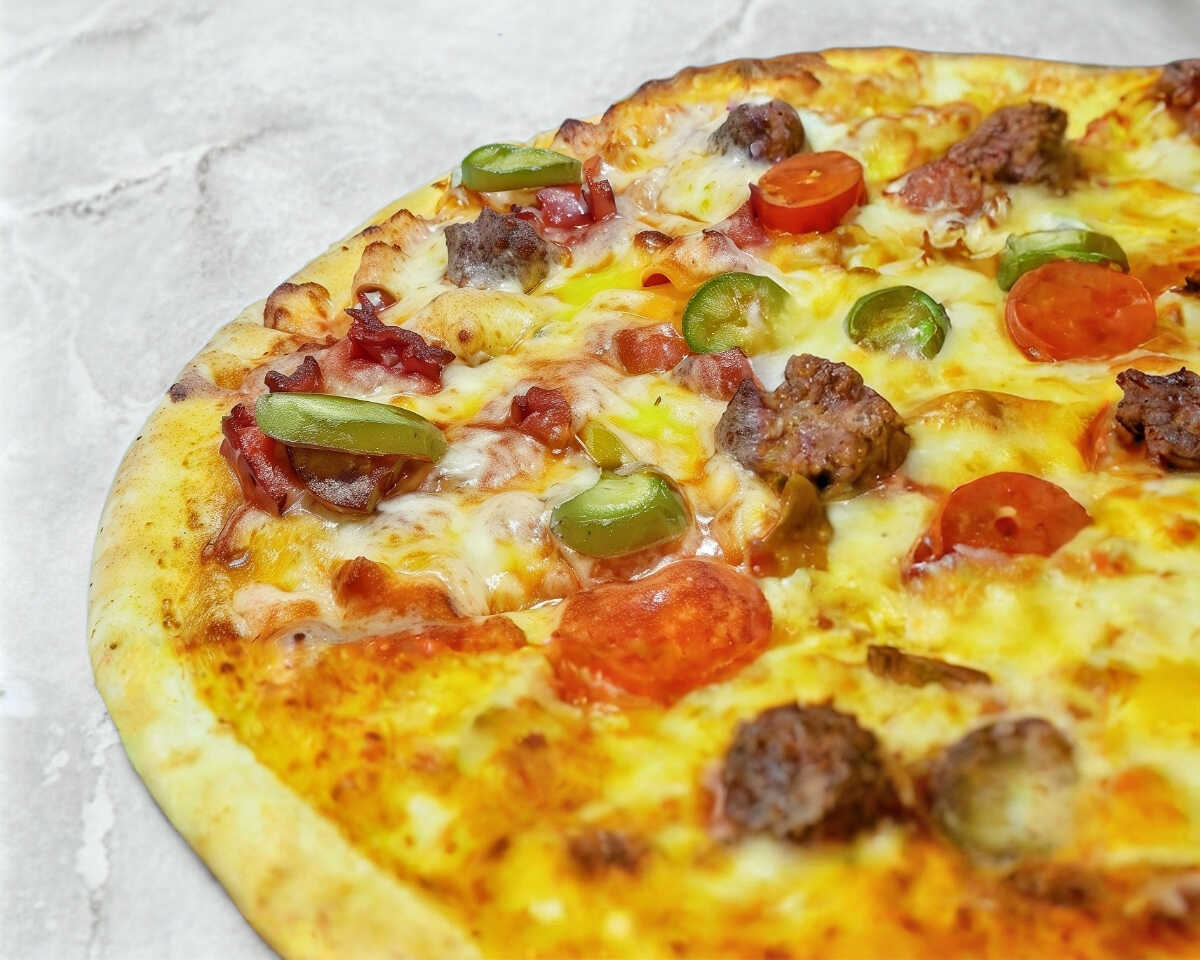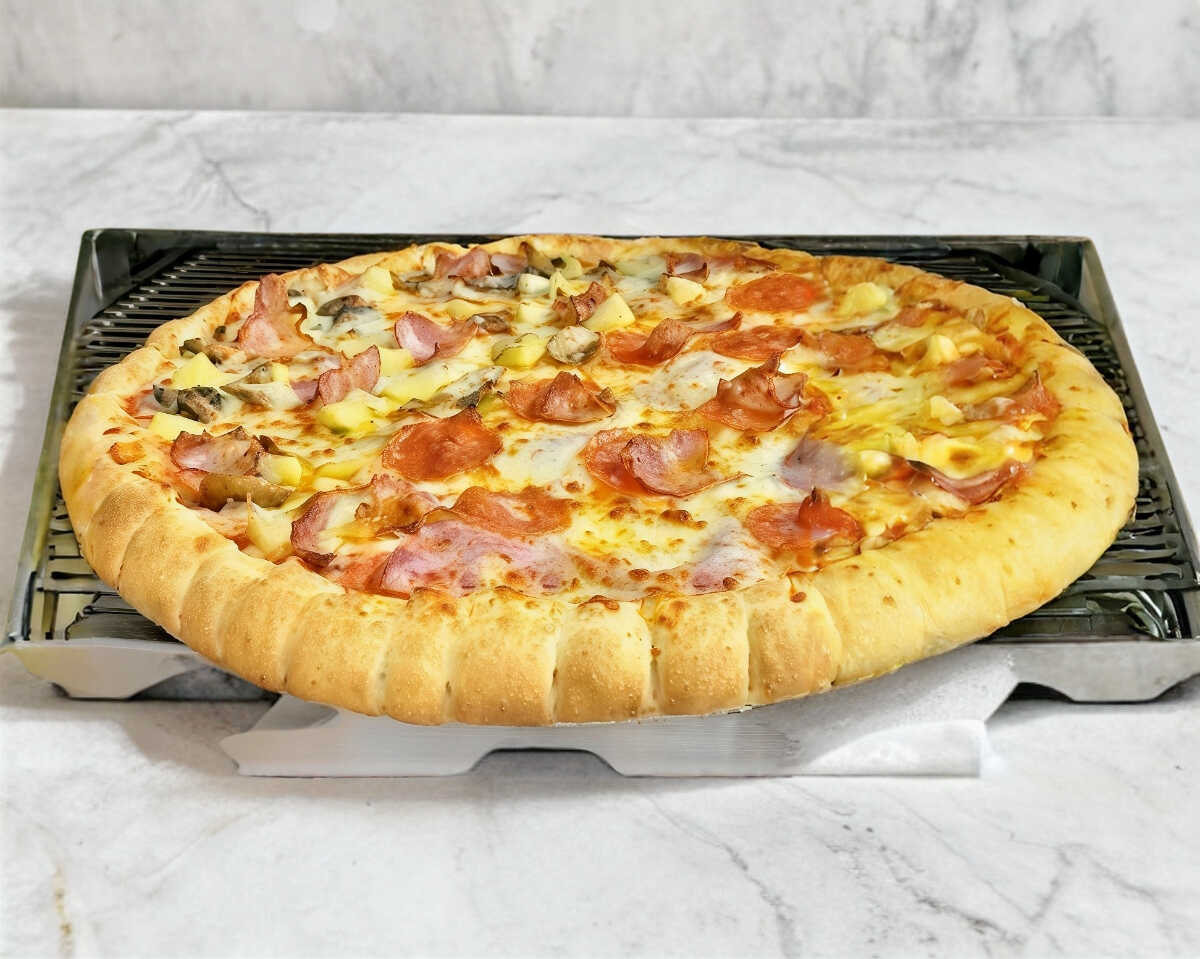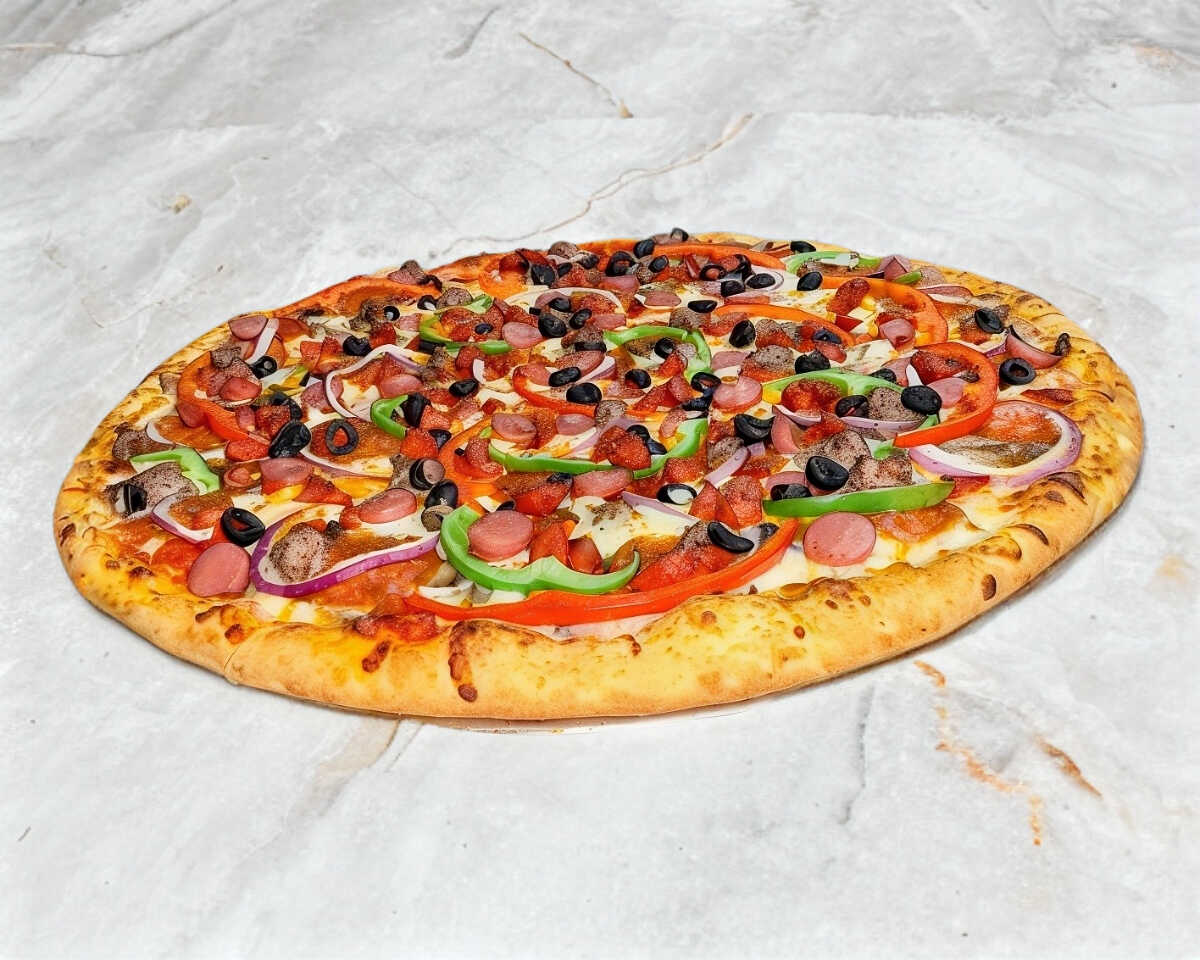 (jamón, pepperoni, champiñones, pimientos, cebolla M. aceitunas negras, salchicha