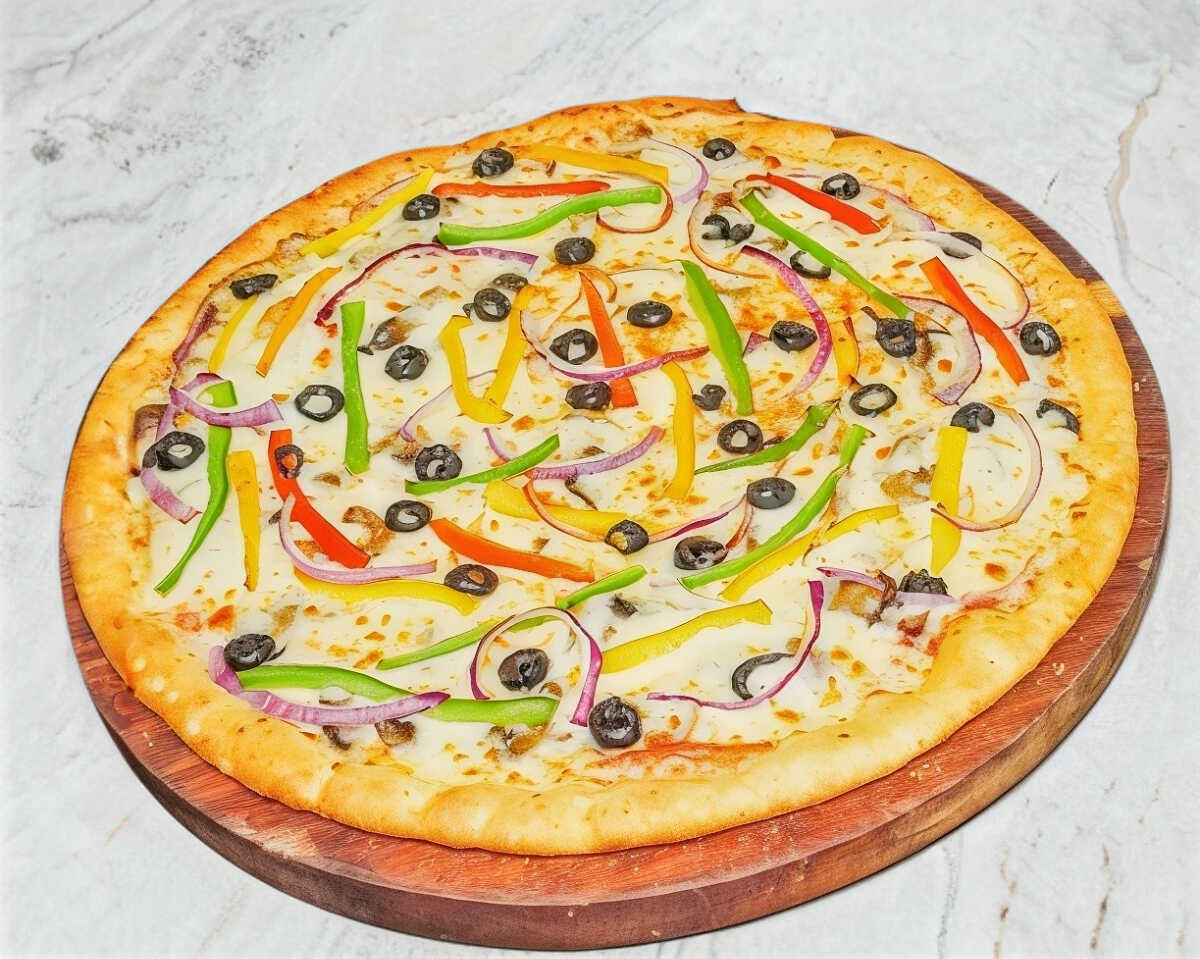 Champiñones,cebolla morada, pimientos, aceitunas negras condimento italiano y mozzarella