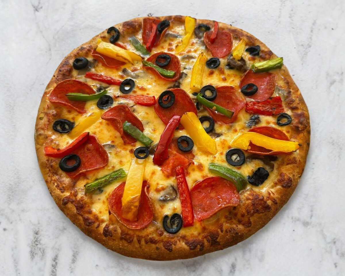 (pepperoni, champiñones, jamón, pimientos, aceitunas, negras y mozzarella)