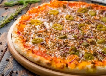 Chorizo, jalapeños, carne molida, cebolla y mozzarella