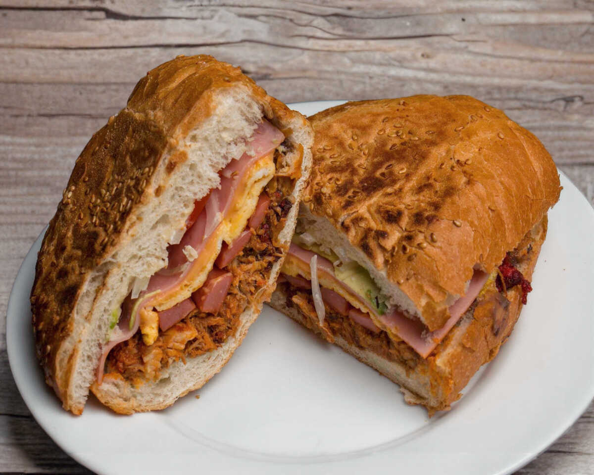 Pierna, jamón y queso Oaxaca preparada con mayonesa, frijol, jitomate, aguacate y cebolla.