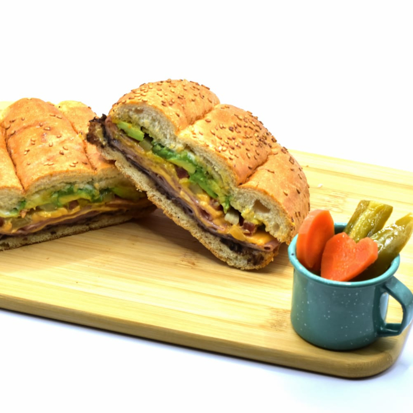Rebanadas de jamón, mayonesa, frijoles refritos, queso blanco, aguacate, cebolla y jitomate. con el picante de tu elección.