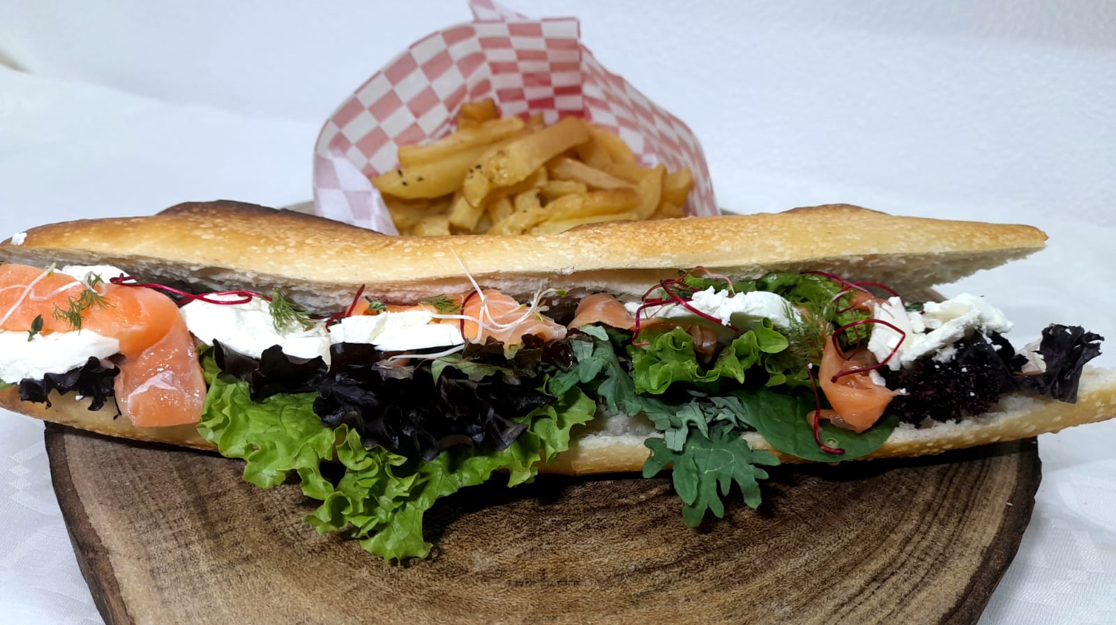 Sandwich de baguette con salmón, queso de cabra,ensalada, salsa aioli, acompañado con papas a la francesa caseras.