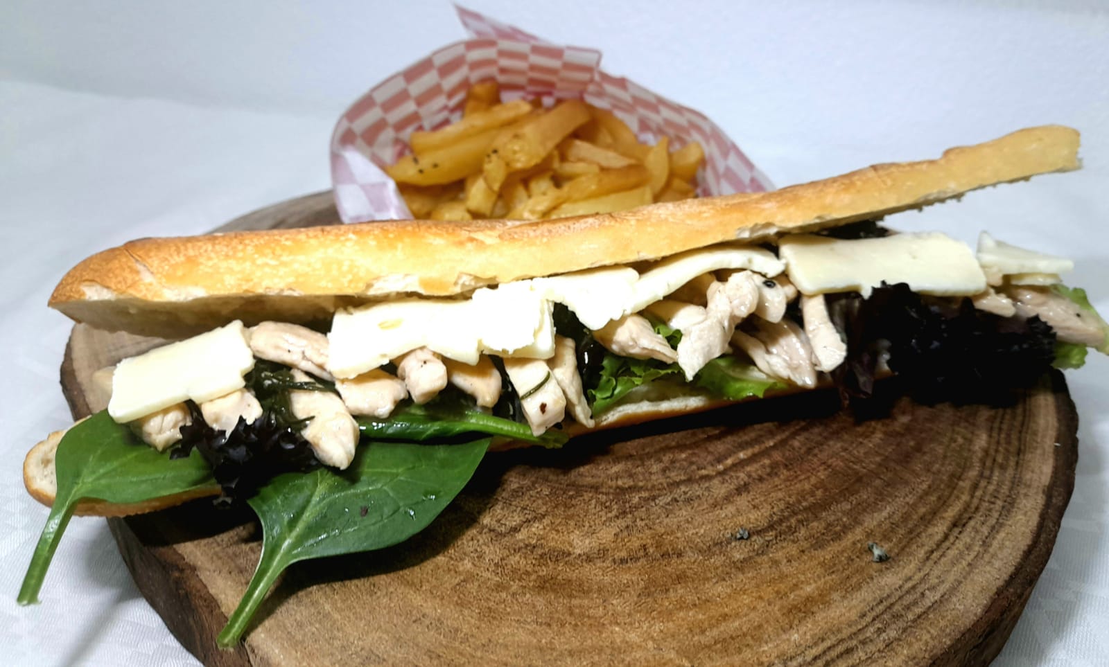 Sandwich de baguette con ensalada, pollo, queso acompañado con papas a la francesa caseras.