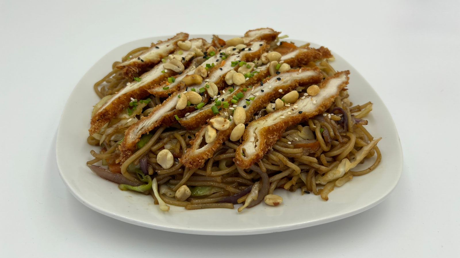 deliciosas verduras y pasta salteadas con soya natural , pollo empanizado