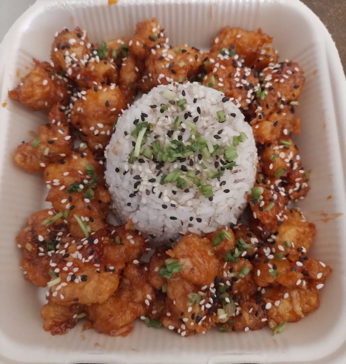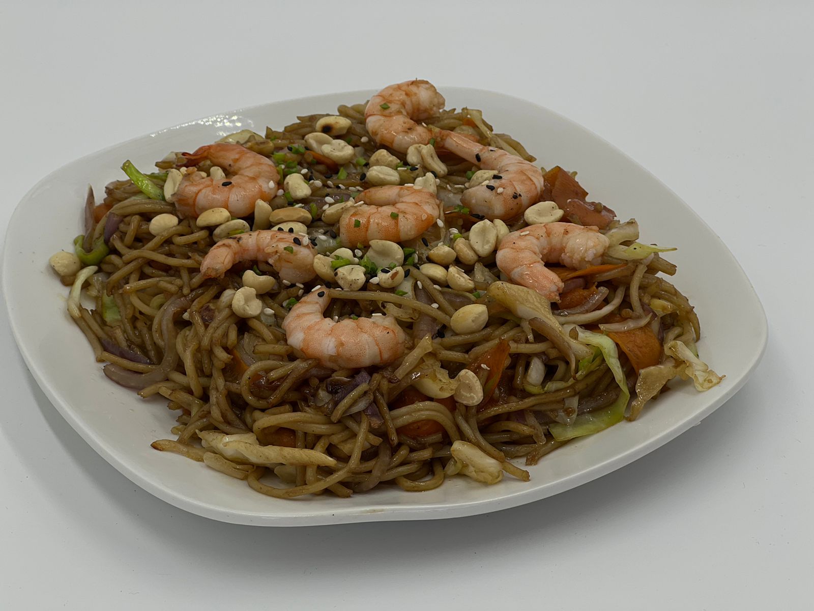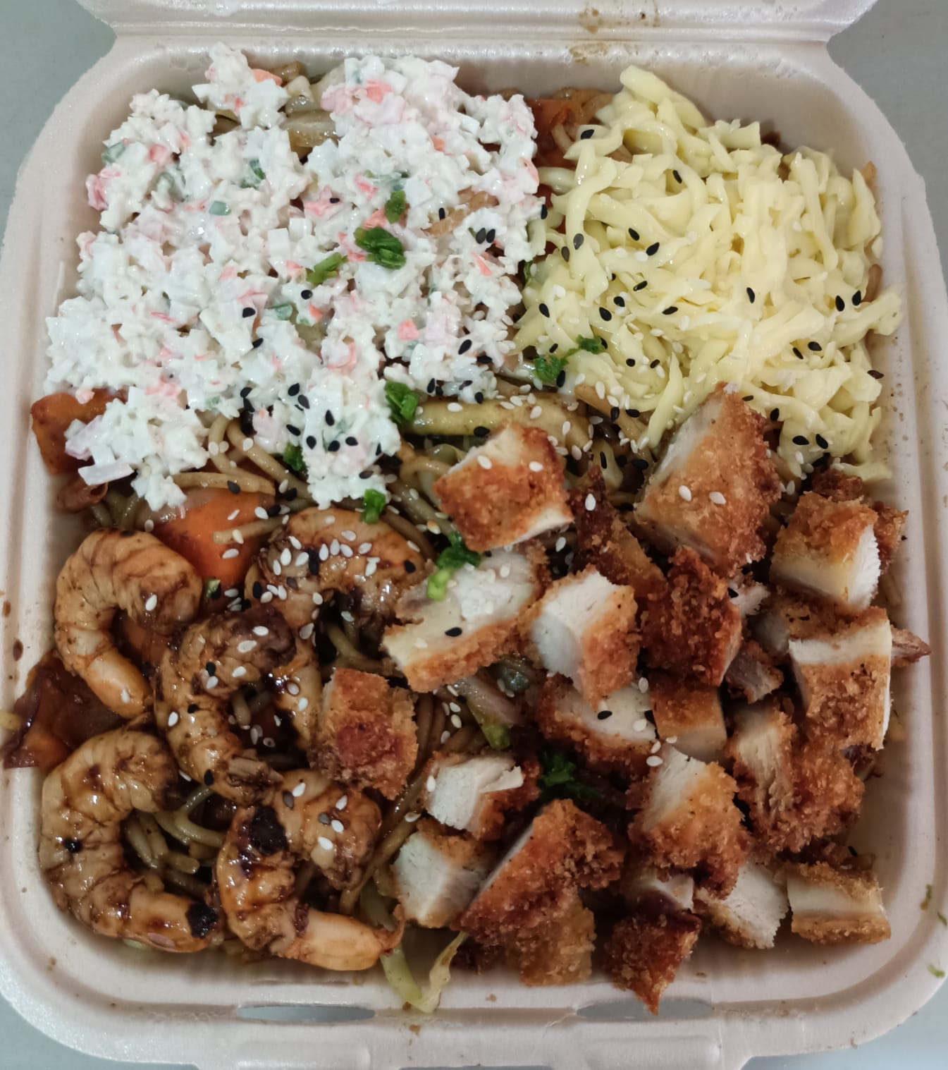 desliciosas verduras y pasta salteadas con soya, tampico, queso, camaron y pollo empanizado