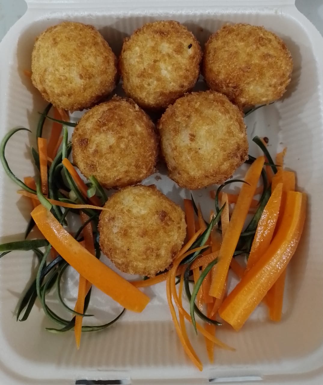 6 bolitas de arroz con relleno de tampico y empanizadas