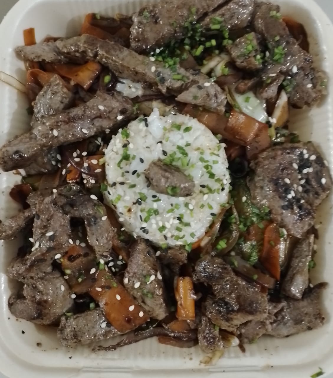 deliciosas verduras y pasta salteada con soya natural, arrachera