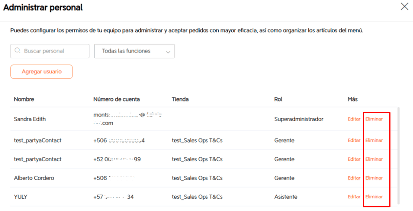 Si deseas eliminar un usuario, en la misma sección, del lado derecho podrás seleccionar la opción de eliminar.